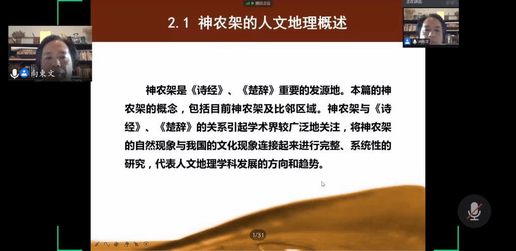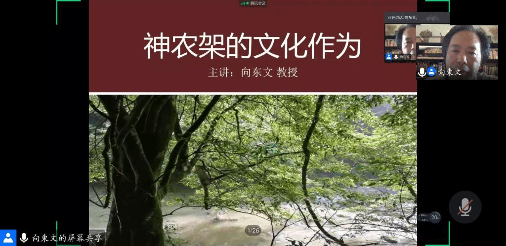 (通讯员 袁昌华,李远威)7月22日15时,“明德”名家学术论坛第二期讲座在腾讯会议上举行,本次活动由华中师范大学文学院2019级基地班主办,邀请了中国地质大学艺术学学术带头人、中国美术家协会会员、中国绿色矿山智库专家向东文教授,以“神农架的文化作为”为题进行专题讲座,文学院各年级基地班同学及校内外师生参加了本次活动,会议由2019级基地班导师王海龙主持。