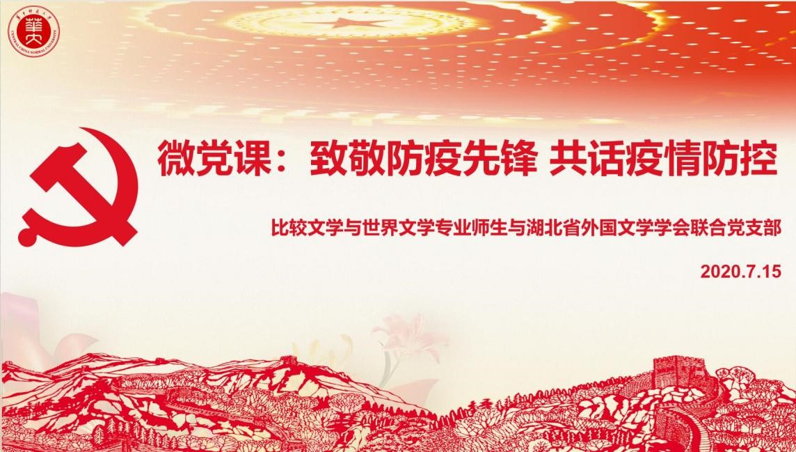 (通讯员:朱家琪)为贯彻落实党中央关于常态化疫情防控的决策部署,充分发挥我校基层党组织战斗堡垒作用和师生党员先锋模范作用,让党旗始终高高飘扬在疫情防控、返校复学、事业发展全过程,比较文学与世界文学专业师生与湖北省外国文学学会联合党支部积极开展基层党组织常态化疫情防控“四个一”行动之“讲好一堂党课”线上活动。本次主题党日活动由支部副书记彭颖同志担任主持人,党委副书记徐福刚同志与支部书记黄晖同志担任党课主讲人,教师党员、学生党员及入党积极分子共同参与。