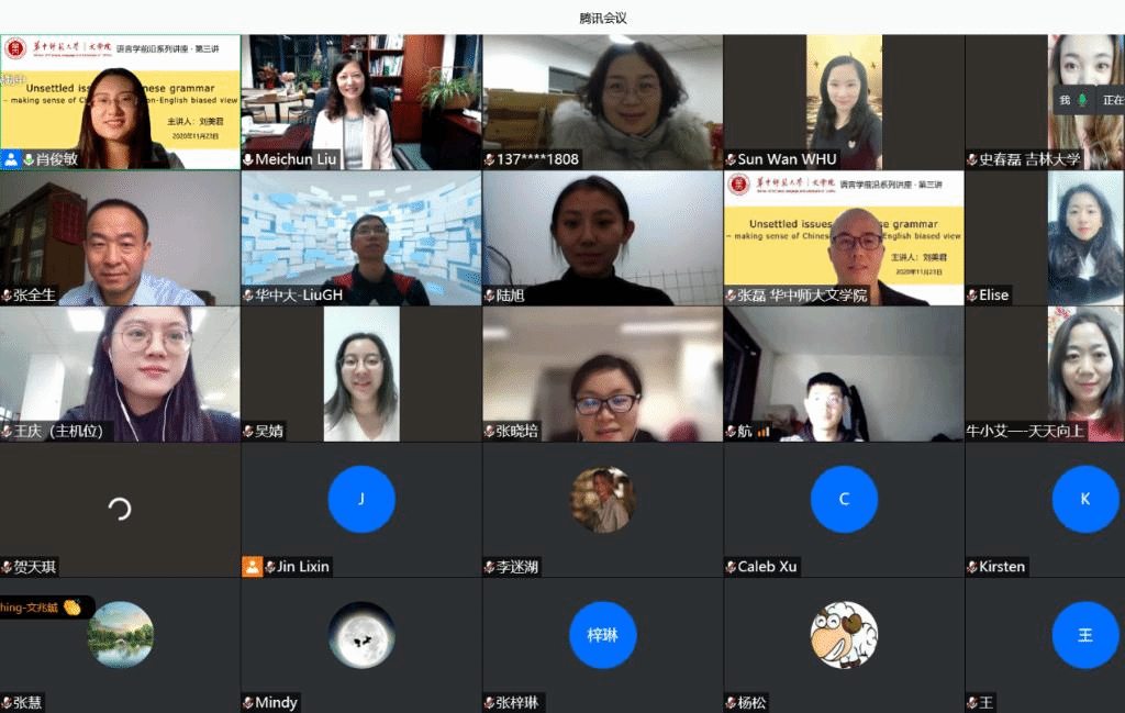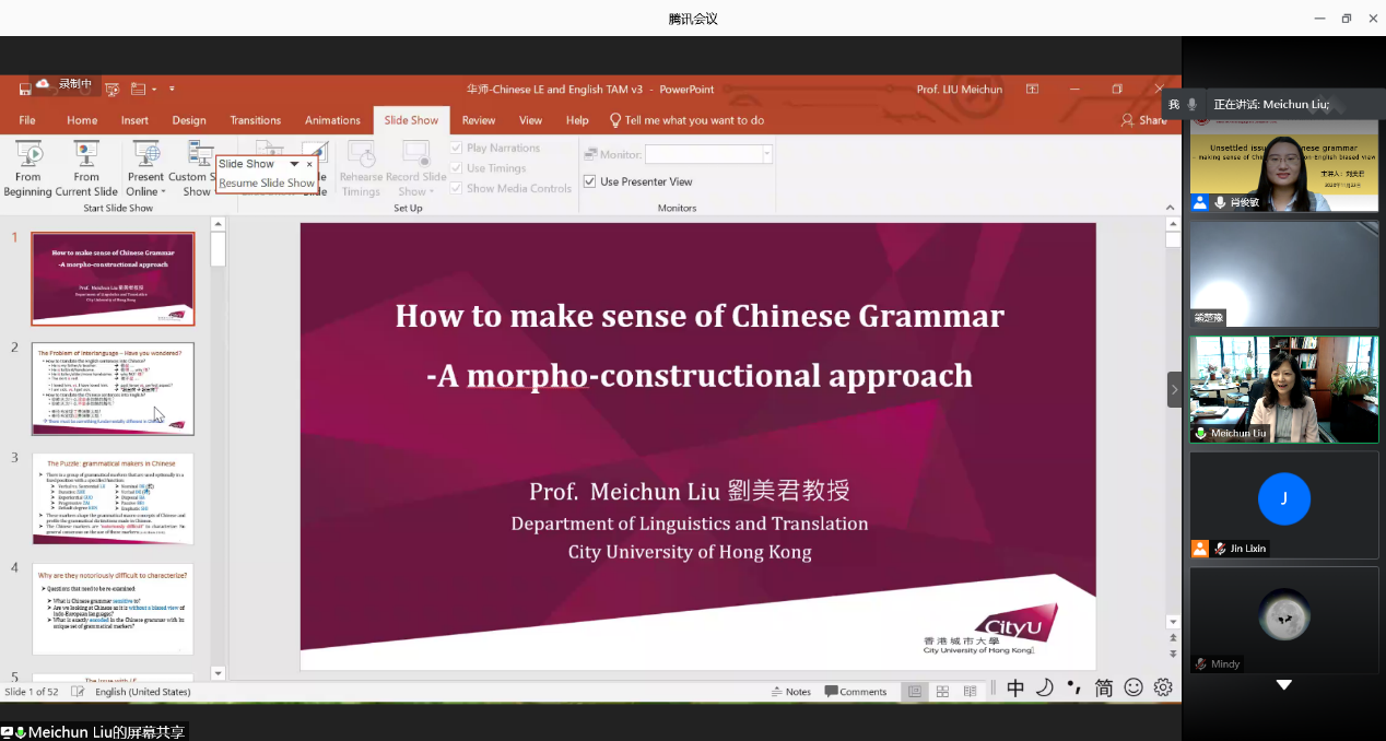 (通讯员 张瑜 张敏)11月23日下午,由华中师范大学文学院“中国语言文学一流学科”支持,“语言学前沿理论与应用研究”青年学术创新团队主办的“语言学前沿”系列讲座第三讲成功举办。香港人文学院院士、香港城市大学翻译及语言系主任刘美君教授应邀为师生带来了一场题为“Unsettled issues in Chinese grammar——making sense of Chinese with a non-English biased view”的精彩的线上学术讲座。本次讲座由文学院教师肖俊敏博士主持。