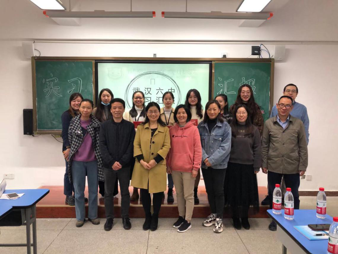 接着,王院长与黄老师赴武汉六中听取实习汇报会。会议伊始,实习小组组长李佳艺进行实习总结汇报,主要从实习概况、教学活动、教研活动与班级年级活动四方面展示实习成果,并代表全体实习生对指导老师的悉心教导表达了诚挚感谢。接着,六位教学指导老师依次发言,一方面肯定了各位实习生的努力与进步,另一方面也提出寄语,希望实习生尽快完成学生向教师身份的转变。随后,武汉六中副校长王晓文发表讲话,他代表武汉六中肯定了文学院实习生的实习表现与成果,并指出实习工作也是对大学学习和师范技能的查缺补漏,是一个不断夯实基础的过程,也期待华师输送更多优秀的实习生。紧接着文学院副院长王洪涌总结发言,她十分感谢武汉六中对华师实习工作的大力支持,能够为实习生提供锻炼成长的空间,希望两校未来可以继续加强交流与合作;同时也寄语实习生,及时总结实习经验,学习先进教育理念,为今后的教学工作打下良好基础。会议结束之时,指导老师向每一位实习生赠送《现代汉语词典》,希望实习生在教育的路上坚持不懈、辛勤耕耘。最后全体与会师生合影留念,圆满完成实习汇报交流工作!武汉六中副校长王晓文、教科室主任谭亚丹、高一年级语文备课组长张明兰、教学指导老师张芬、韩玲、李月梅、皮道勇和李红玉出席本次汇报会。