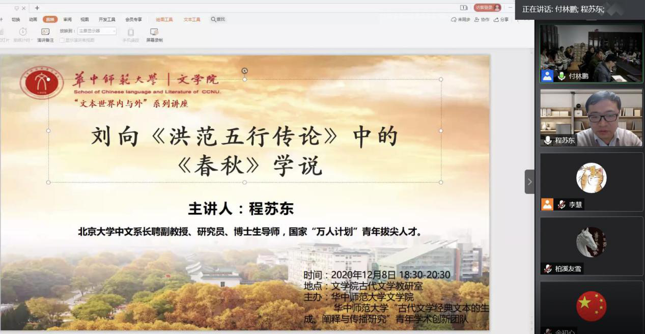 (通讯员 陈依桑 李博涵)12月8日晚,北京大学中文系长聘副教授、研究员、博士生导师程苏东老师通过腾讯会议平台开展了题为“刘向《洪范五行传论》中的《春秋》学说”的学术讲座。此次讲座受中国语言文学一流学科支持,由华中师范大学“古代文学经典文本的生成、阐释与传播研究”青年学术创新团队主办,文学院付林鹏副教授担任主持,李程、苏小露老师以及部分同学于古代文学教研室共同聆听了此次讲座,线上亦有罗昌繁、黄曼、石超、卜兴蕾等老师和来自各大高校的百余名师生参与。