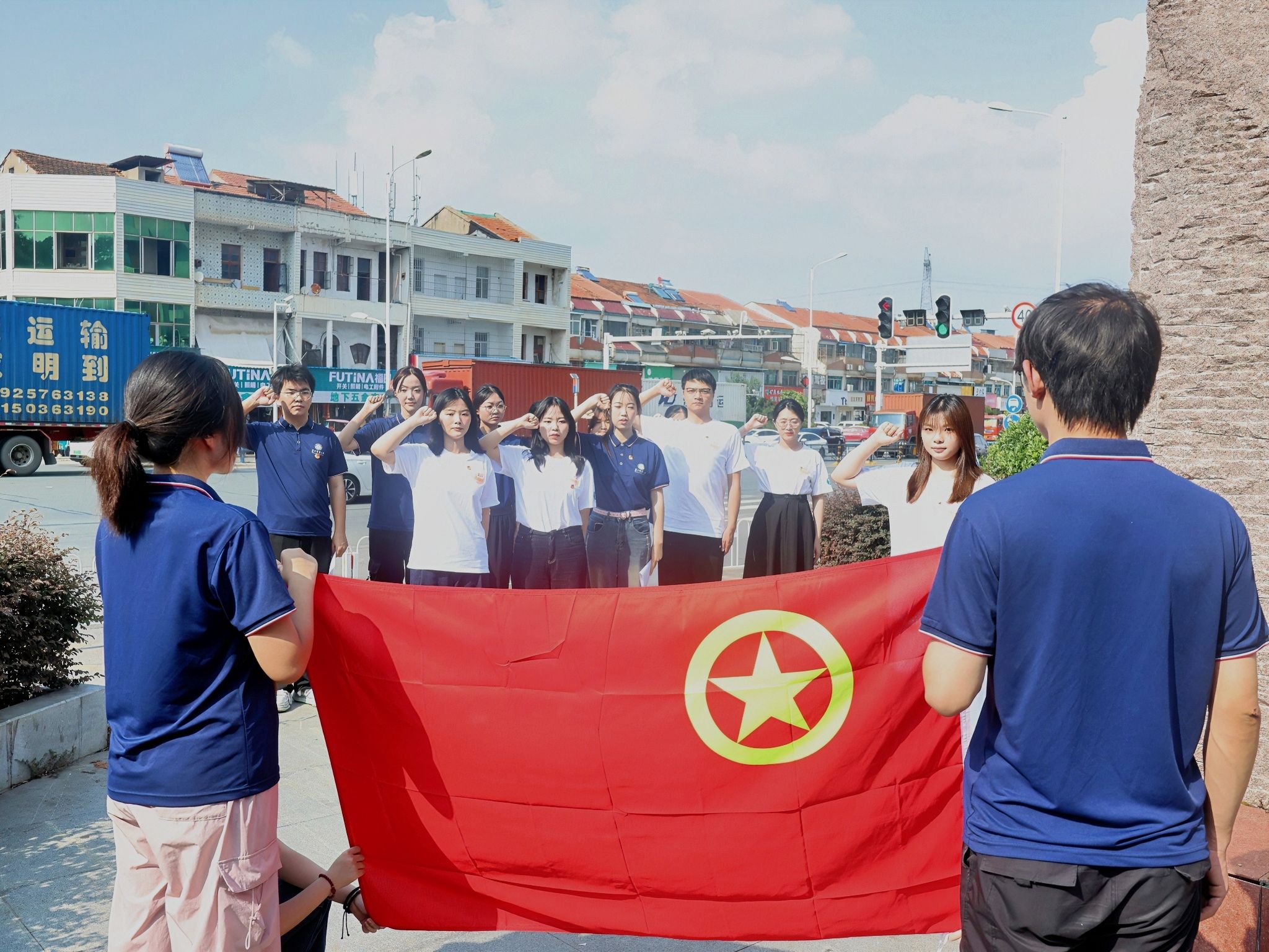 怀着无比崇敬的心情,全体团员在鲜红的团旗下,高举右拳,重温入团誓词。“我志愿加入中国共产主义青年团……”铿锵有力的誓言在雕塑上空回荡,彰显着新时代青年继承革命先辈遗志、践行“强国有我”的坚定信念。