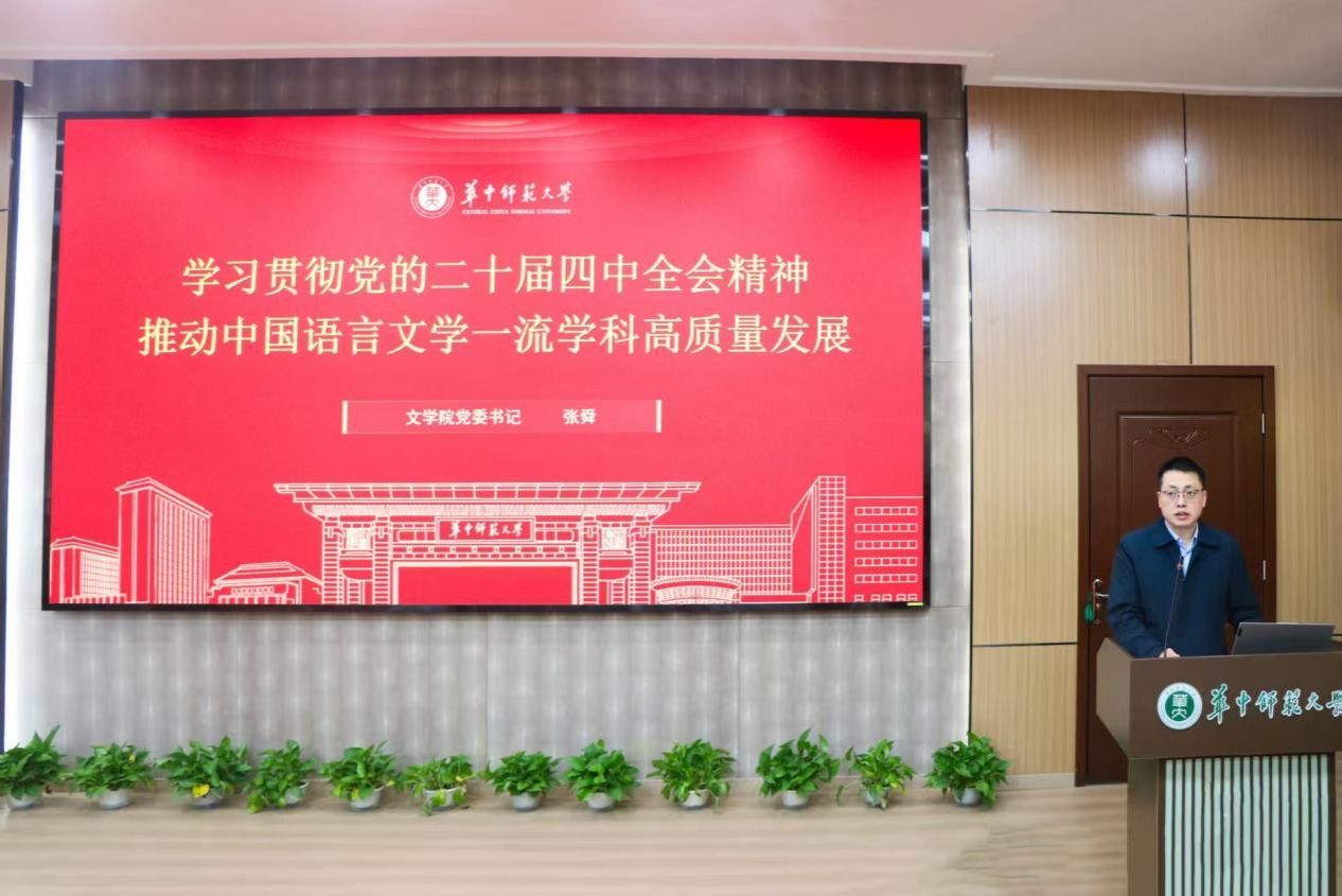 文学院讯(通讯员 邹秦丹)为深入学习贯彻党的二十届四中全会精神,进一步凝聚发展共识,12月17日,华中师范大学文学院党委在2号楼一楼报告厅开展“学习贯彻党的二十届四中全会精神”宣讲。文学院党委书记张舜以《学习贯彻党的二十届四中全会精神 推动中国语言文学一流学科高质量发展》为题,为学院全体教职工讲授专题党课。