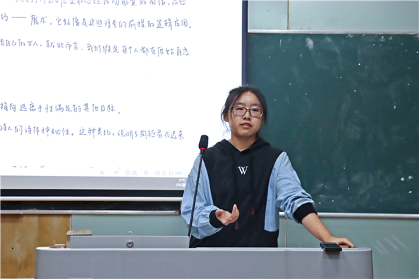 赵婉莹也与同学们分享了自己的思考与探索。她以艾默生对天才作品中含有被摒弃了的异化思想为引,阐述了自己对文学同质化的思考,同时通过举例考量了现代文学中的身体写作与新型小说中出现的模板化现象。其次,她也就书中所呈现的“逆崇高”做了思考并归纳出“逆崇高”的三大来源。最后她指出,“逆崇高”不仅在文学运动,而且在政治运动和艺术超越上都有体现。