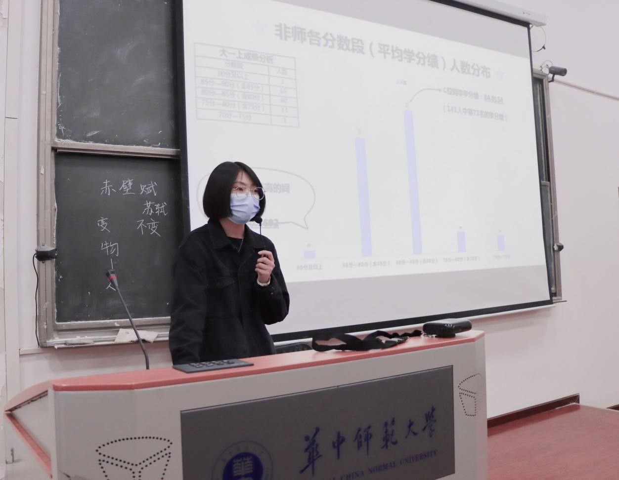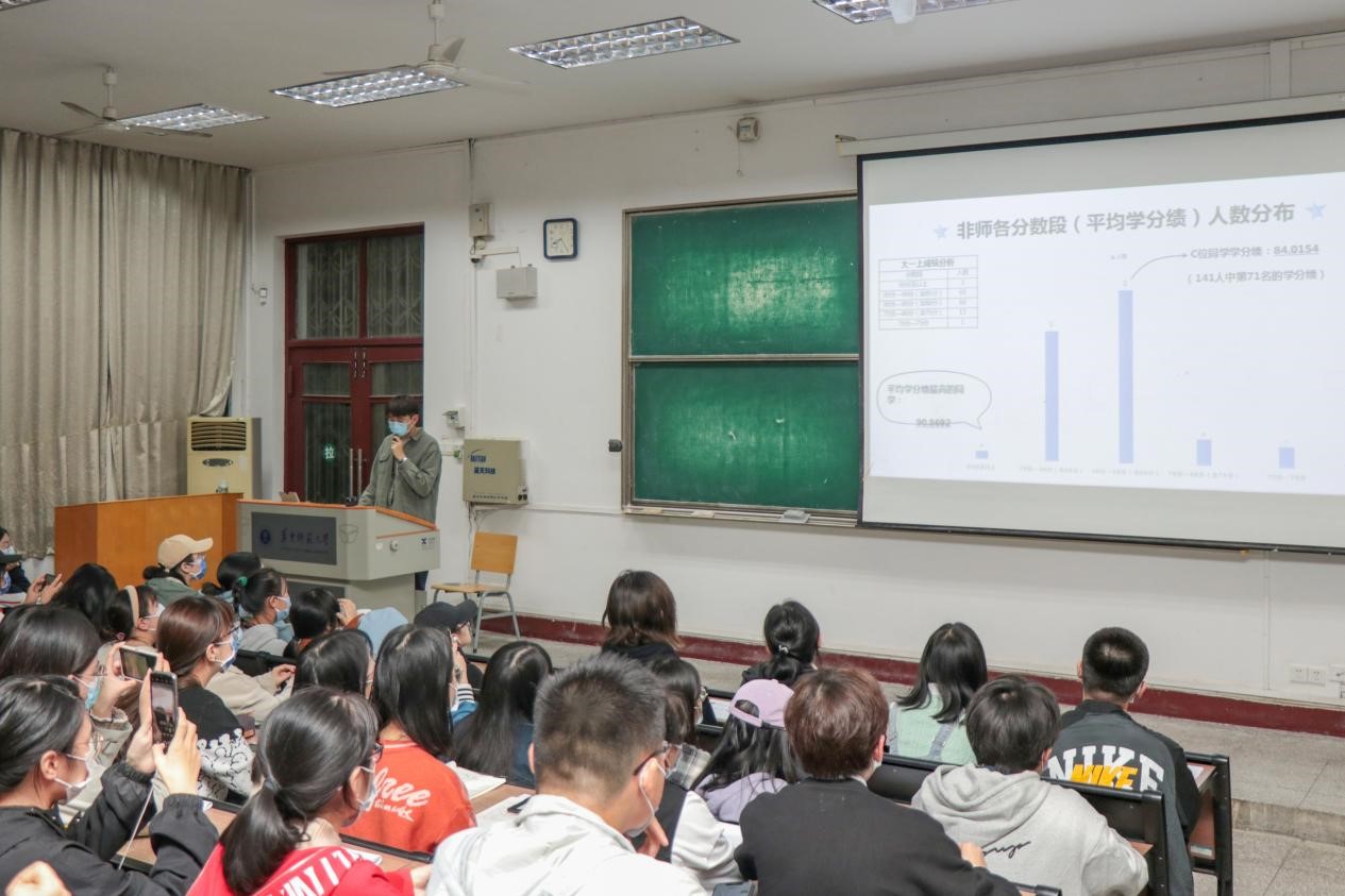 辅导员鲍思琦和马骁以数据可视化的形式为同学们详细分析了文学院2020级学生在大一下学期的整体学业情况,包括两专业各分数段人数分布与五大专业主干课成绩情况等。在学情分析后,辅导员鲍思琦鼓励同学们要在新的学年中充分利用时间,提升自己的学习能力,夯实人生之基,为未来发展做好铺垫。辅