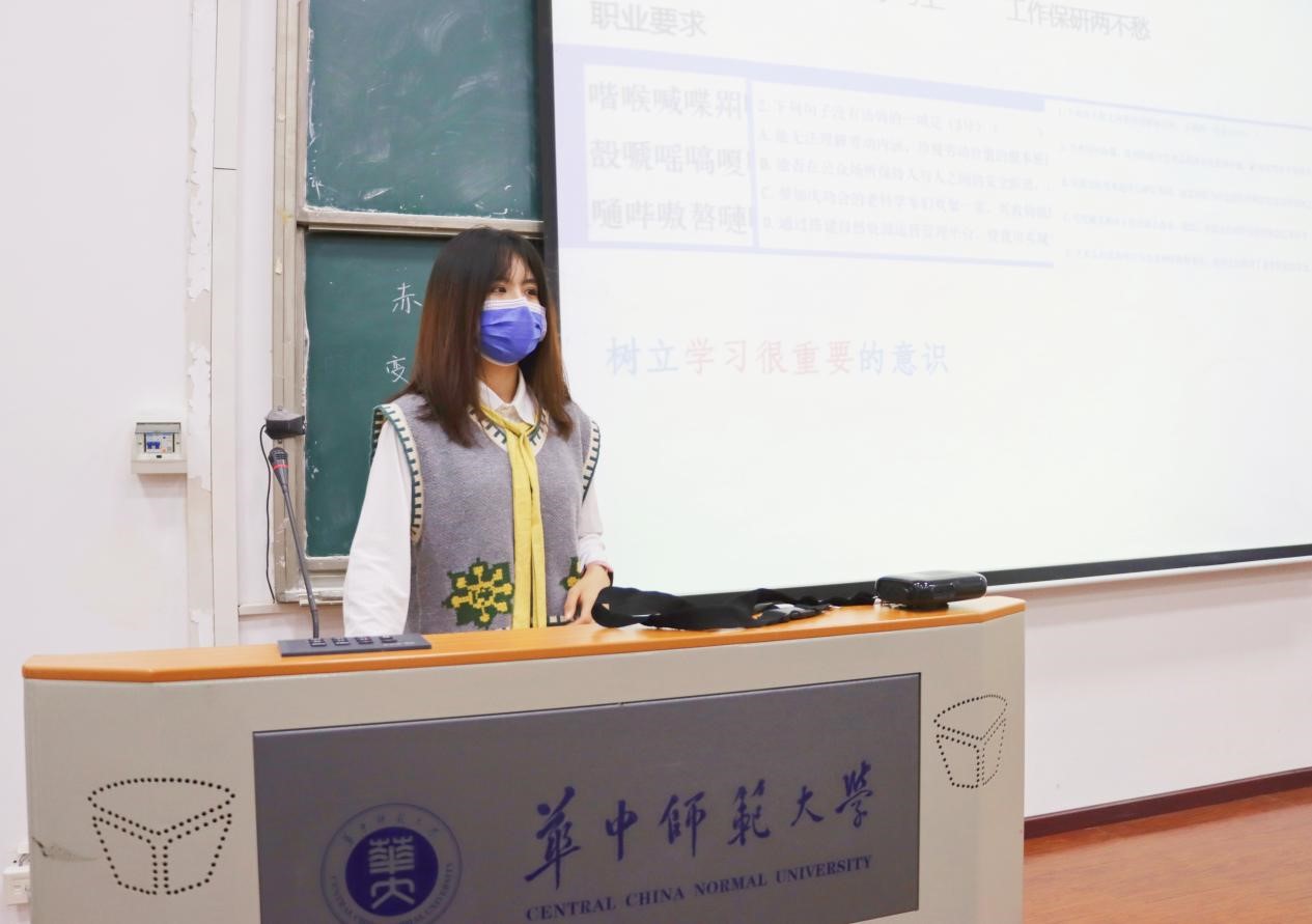 在汉语言文学(公费师范)的晚点名中,由官瑞雪向大家分享自己在过去一年的学习心得。官瑞雪同学提出要注重学习动力的创造,树立“学习很重要”的意识,并要找到适合自己的学习方法,如学习时间和学习地点,更要培养好自己的学习触发机制。对于重要的考前复习,官瑞雪同学分享了要做到课上专心,课后以写促记相结合的方法。官瑞雪同学告诉大家在学习之余,也要不断丰富充实自己的课外生活。