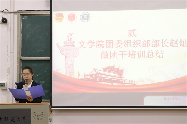 活动伊始,刘雨菲介绍了会议流程。随后,文学院团委组织部部长赵灿对此次团干培训做出总结。她首先对此次团干培训中学员们的优秀表现表示肯定,但也指出了不足之处。接着,刘雨菲公布获得“优秀小组”称号的小组名单,并邀请杜雨薇为优秀小组颁奖。