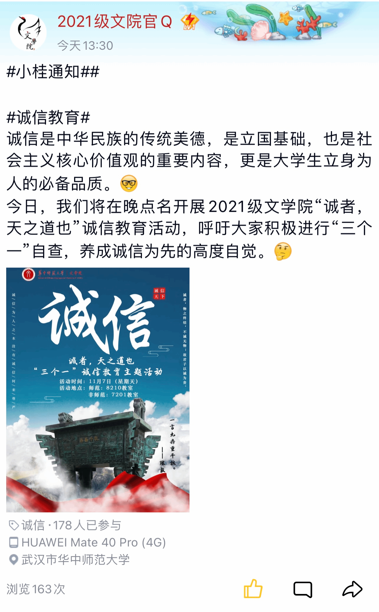 君子养心,莫善于诚。11月7日晚,华中师范大学文学院21级举办了以“诚者,天之道也”为题的“三个一”诚信教育晚点名活动。活动期间同学们积极参与“三个一”自查,即个人征信、学费缴纳与图书馆借阅预约情况自查,并进行诚信呼吁。晚点名紧贴时代背景,强调诚信重要性,结合文学院专业特色,旨在让同学们了解自己的信用情况,主动发现并解决信用问题,养成诚信为先的高度自觉,深刻体会诚信作为中华民族传统美德和立国之基的重要性。