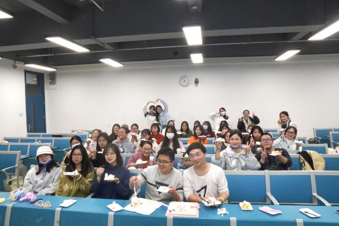 节目结束后,在欢声笑语中,班委们端上蛋糕,将生日会的气氛推向了高潮。班导师陈蓓和辅导员陈若千共同为大家切蛋糕,并对同学们表达了生日祝福。在所有同学都分到蛋糕后,大家以手机闪光灯作为烛光,在彼此的陪伴下一同许下了二十岁的生日愿望。最后,全班同学一起合影留念,定格下二十岁时最美好的模样。随着班歌《桂子花开的路口》再度唱响,本次生日会圆满结束。