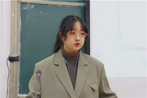 活动伊始,王悠扬简要介绍了本次演讲比赛的基本流程。参赛选手共分为八组,每组演讲完毕后由评委老师进行一次点评。第一、二小组的演讲主题为“劝君惜取少年时”。张瑷婕从课文《哦,香雪》中香雪与文具盒的故事出发,带领同学们进入了香雪的内心世界;第三、四小组的演讲主题为“月是故乡明”。江希婷在演讲中将自己预设为“教师”的角色,向同学们讲述了她在家乡为老党员整理生平资料的实践经历。接着,张筱南老师对前四组的演讲进行了点评。她强调,演讲最重要的是“以情动人”,让观众能够心生“我也是这样想的”的想法。如果只是平铺直叙,哪怕逻辑严密,观众也只会评价“你讲得有道理”。