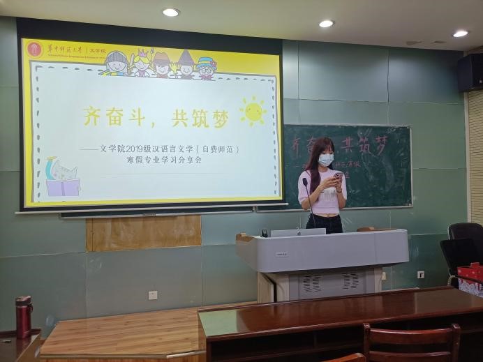随后,同学们依次上台进行专业学习汇报。大家讲述了过去一学期的收获和遗憾,分享了寒假进行专业学习的心得体会,并对未来的学习生活表达了期望。专业同学李欣禧表示,从中国语言文学专业分流至自费师范专业,于她而言是大学生活的重要转折,丰富多样的师范类课程让她对“语文”课有了进一步的了解,虽然压力很大,但是她也相信自己能够早日成为一名合格的语文教师。