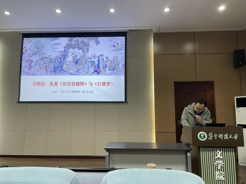 (通讯员 曾宇阳)3月25日下午三点,武汉大学文学院教授、博士生导师王怀义教授作客中国语言文学基地班第七期“明心”学术沙龙讲座,以“对照记:仇英《汉宫春晓图》与《红楼梦》”为题作了一场精彩的讲演。此次讲座在文学院一楼学术报告厅举行,由华中师范大学文学院2019级基地班主办,文学院基地班同学及部分硕博研究生参加,基地班导师王海龙主持。