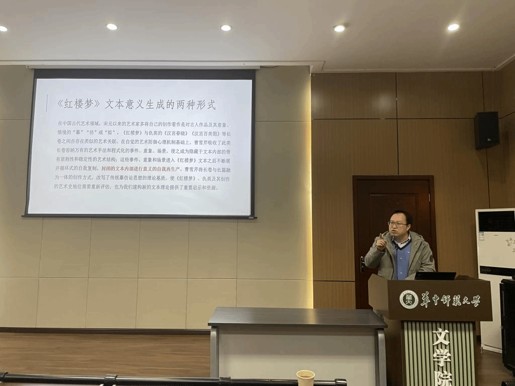 王怀义教授十分注重研究者的研究态度与过程,他认为研究者一定要看到画作的真迹才可以下结论。从事《红楼梦》与绘画主题的相关研究是一件高要求的事,不可马虎。然后王怀义教授又为同学们介绍了多位在红学研究上颇有建树的学者,例如国内的商伟教授和国外的蒲安迪教授。最后,王怀义教授就《红楼梦》文本意义生成的两种形式做出更深刻的阐发,讲座也步入尾声。