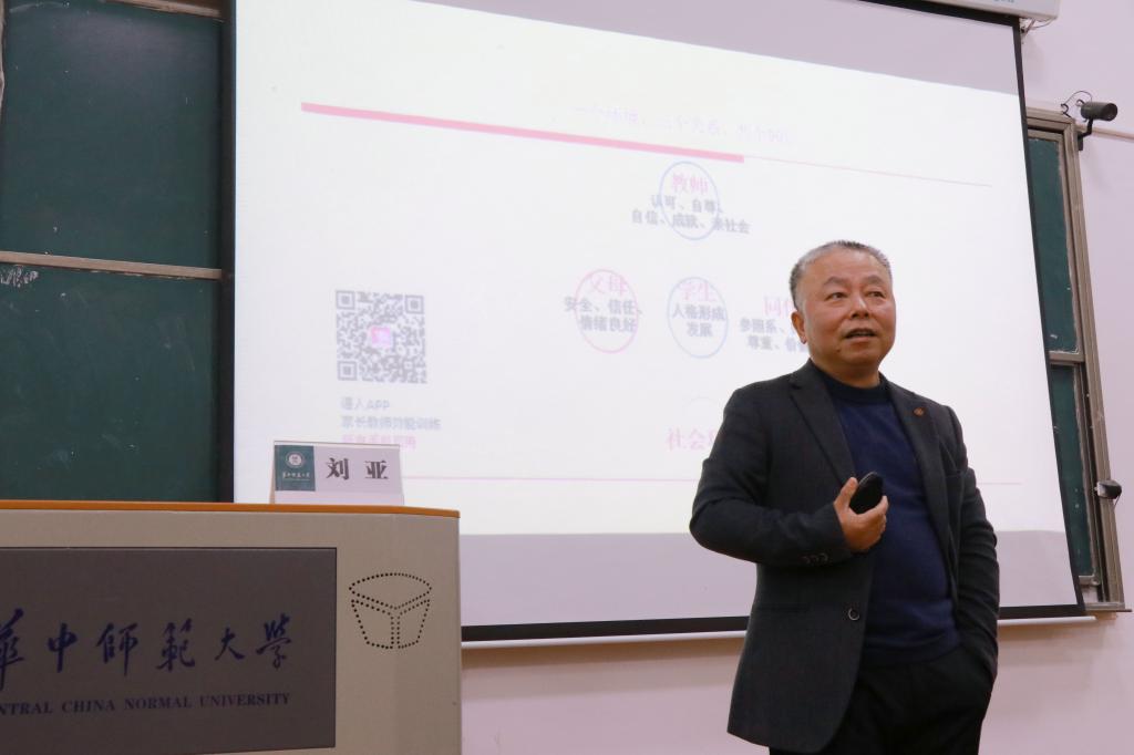 紧接着,刘亚将自己总结的经验分享给同学们,并对在座的“未来青年教师”寄予厚望。他表示应当尊重学生的主体地位,不以“上下级”来区分学生和老师的关系。同时,要善于倾听理解,以学生的角度来看待、分析问题,适时表达对学生的关切。其次,要积极关注学生状态,用期待替换批评,以爱来感化学生。最后,刘亚总结道:“要心中有爱、目中有人,以点滴之言行重构师生关系,于真诚沟通中实现教书育人。”