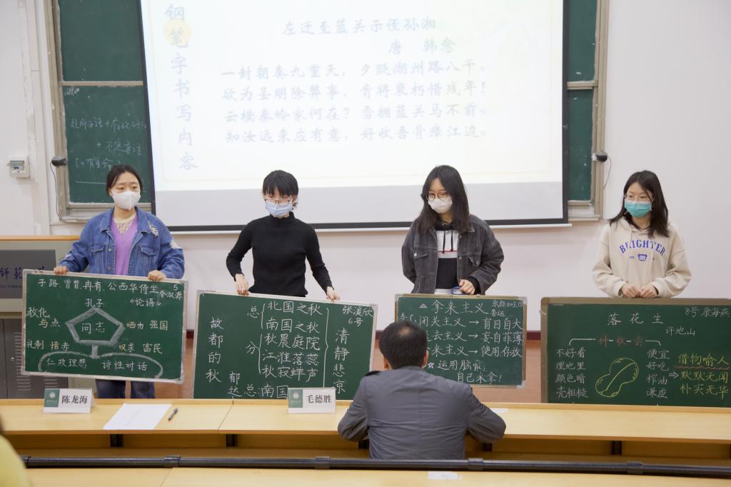 正午时分,从初赛中脱颖而出的31名文院学子陆续来到比赛现场。其中,有9名同学同时晋级钢笔字和粉笔字复赛。本次比赛分为钢笔字书写和粉笔字板书设计两场,每场比赛的时间均为二十分钟。12点20分,比赛正式开始,首先进行的是钢笔字书写比赛,书写内容为唐代诗人韩愈的律诗《左迁至蓝关示侄孙湘》。各位选手全神贯注,教室里只能听到笔尖行于纸上的“沙沙”声。