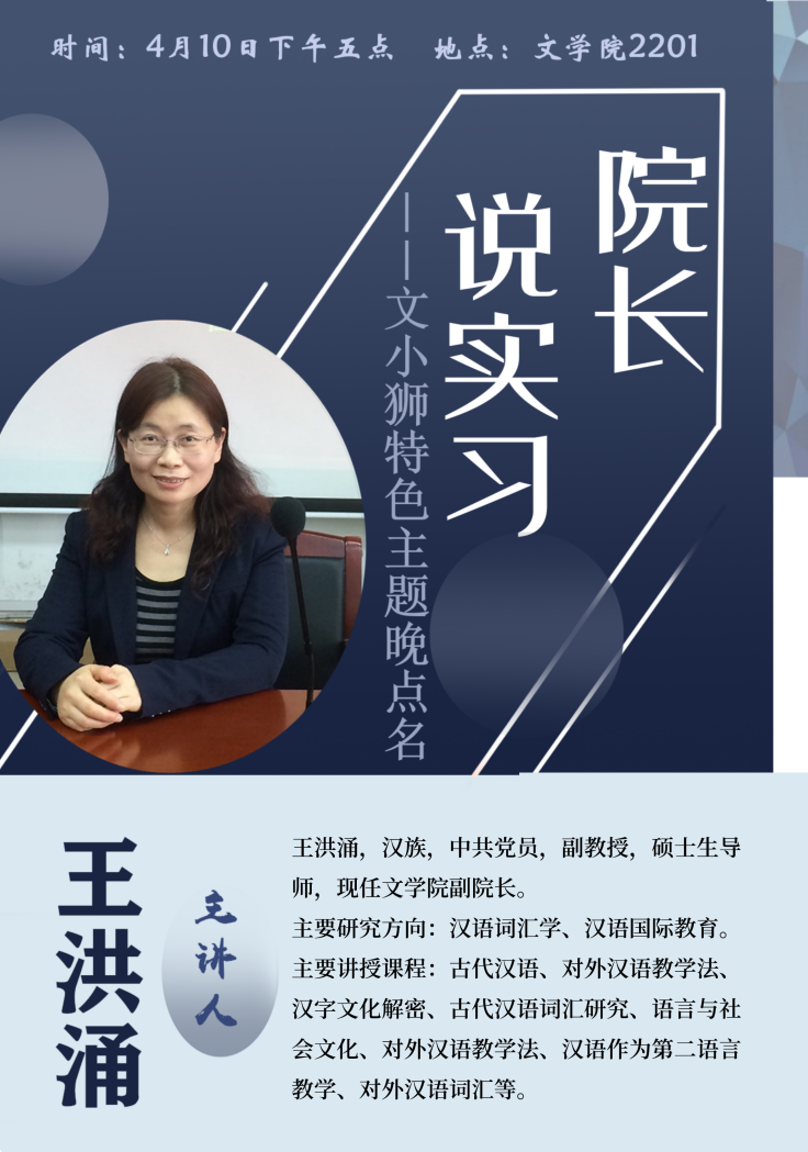 (通讯员 原紫玲 喻腾玉 龚双祺)4月10日晚,由华中师范大学文学院2019级公费师范主办的“院长说实习”——文小狮特色主题晚点名于文学院2201教室举办。本次活动邀请了文学院副院长王洪涌担任主讲人,重点对见习、研习与实习的流程以及学生们所提的关于实习的问题进行介绍与解答。