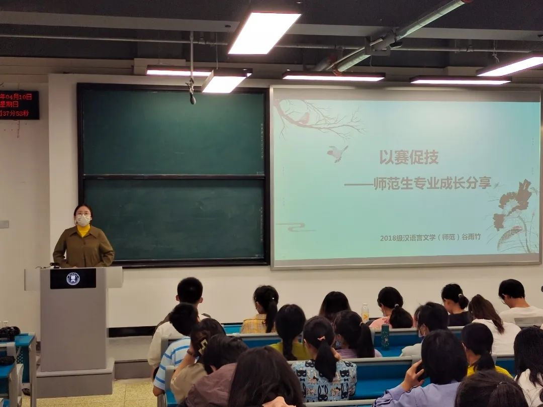 本次分享会特邀文学院2018级优秀公费师范生谷雨竹担任主讲人,重点从师范生技能相关比赛、比赛的意义以及如何充分利用比赛等方面进行经验分享。此次主题分享旨在传播“以赛促学、以赛促教、以赛促用”的教学活动理念,加强师范生基本教学技能训练,提高师范生的就业竞争力,提升师范生的培养质量及教学能力。