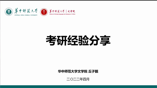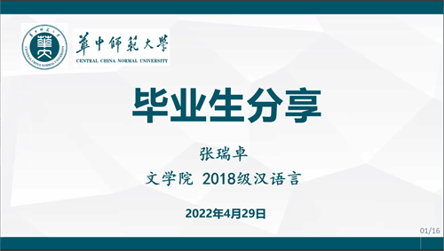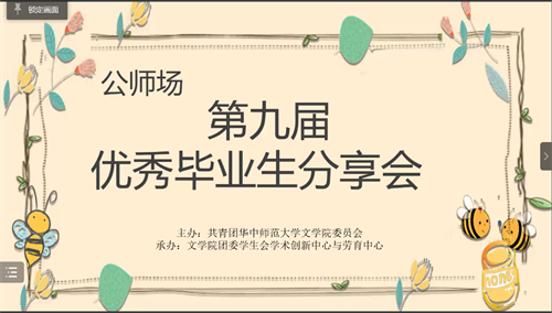 (通讯员 何晓蕾 丁丽娜)4月29日晚,由共青团华中师范大学文学院委员会主办、文学院学生会学术创新与劳育中心承办的文学院第九届优秀毕业生分享会在线上成功举办。本次活动分为公师、非师两场同时进行,2018级优秀毕业生代表赵思怡、谢晓雯、丘子靓和张瑞卓受邀作为主讲人参加了此次分享会,文学院20级和21级同学积极参与了线上观看。