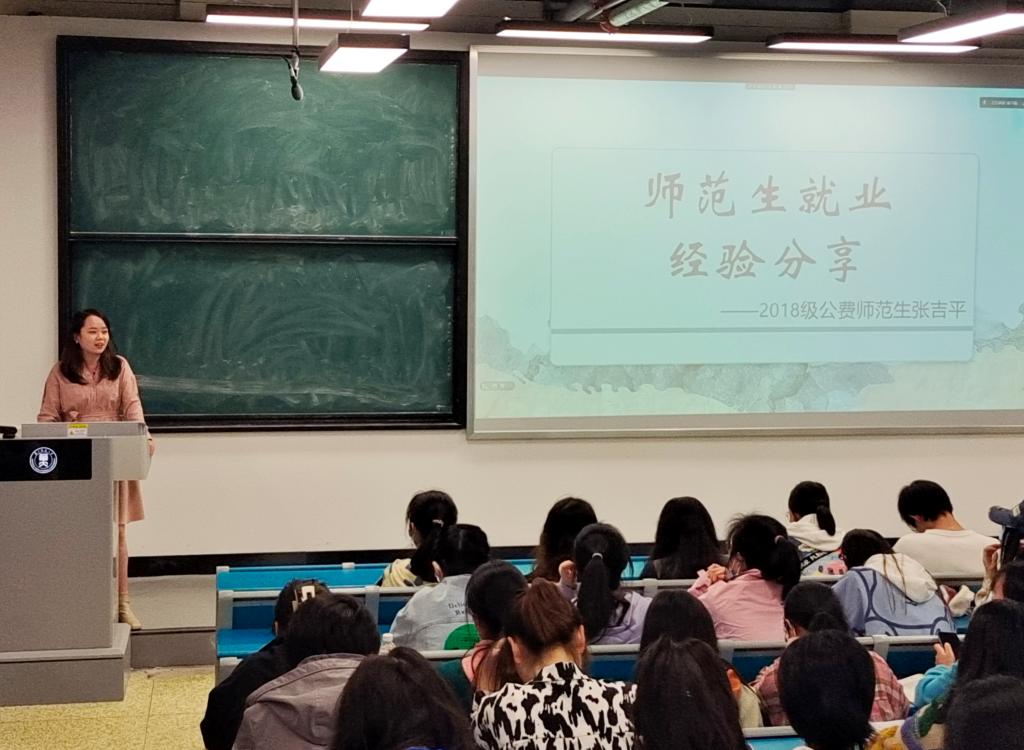本次分享会特邀文学院2018级优秀公费师范生张吉平担任主讲人,以“就业经验分享”为主题与同学们深入交流。此次主题分享会旨在通过对于简历制作、就业招聘的介绍,响应国家关于高校毕业生实现更充分、更高质量就业的号召,加强在校大学生对当前求职就业形势与前景的认识。