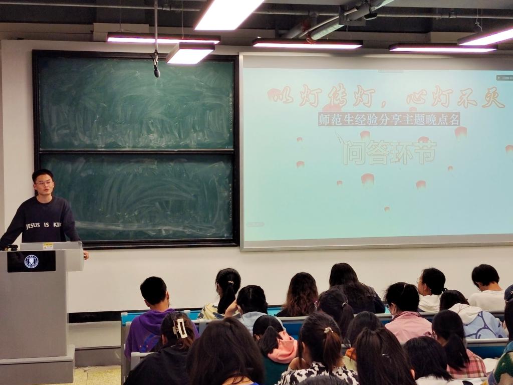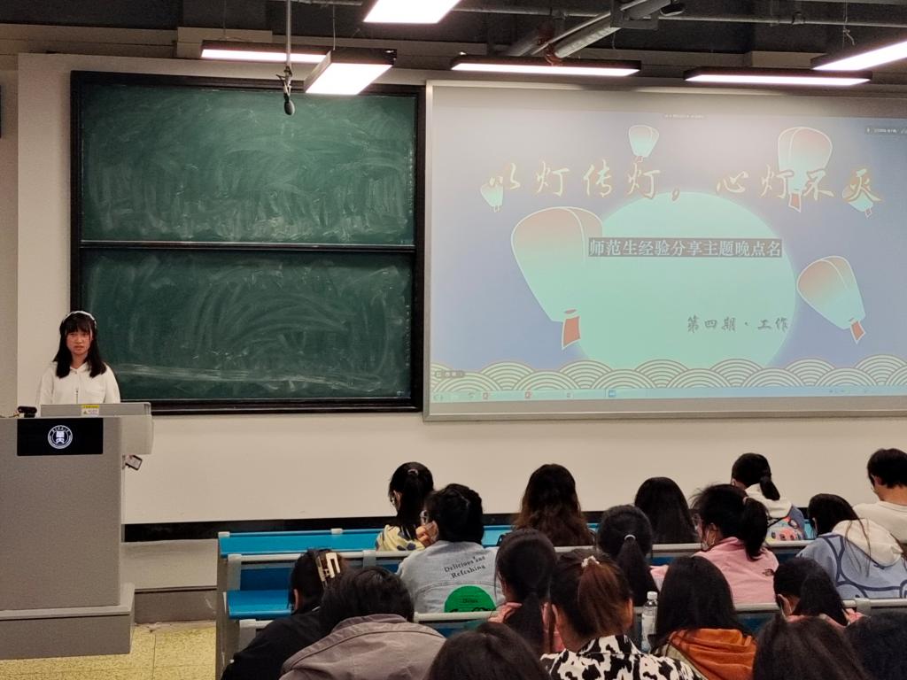 5月1日晚,“以灯传灯,心灯不灭”系列活动暨公费师范应届毕业生经验分享主题晚点名第四期在8210教室顺利举行。本次活动由文学院2021级学生会学习部主办,宣传部协办,学习部部长孔虹茜主持,21级全体同学参加。