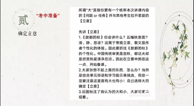 考中准备部分,即现场撰写教学设计及教学实践过程,李贾雪铭指出以下几个注意事项:试讲过程中的导入不必追求深情华丽,结合学情选择合适的导入方式即可;进行过渡语设计时可以采用小问题切分的方式进行衔接;作业设计则需要紧扣教学目标,并且可以设置备用的课堂活动与作业来应对试讲过程中的时间变动。当考核过程中抽到自己不会或不熟悉的篇目时,她提供了通过单元导语和学习提示,选取熟悉的方向以及使用该篇目与自己熟悉的篇目进行对比阅读两种方法。在教学设计选点与实施方面,她提出了“抓大放小”备课方法。抓大即试讲过程中需要有一个统率本次讲课内容的问题或任务并与其他考生拉开差距的立意。“小”则是应尽量避免机械的品读悟,开拓视野,进行适合的对比阅读教学。