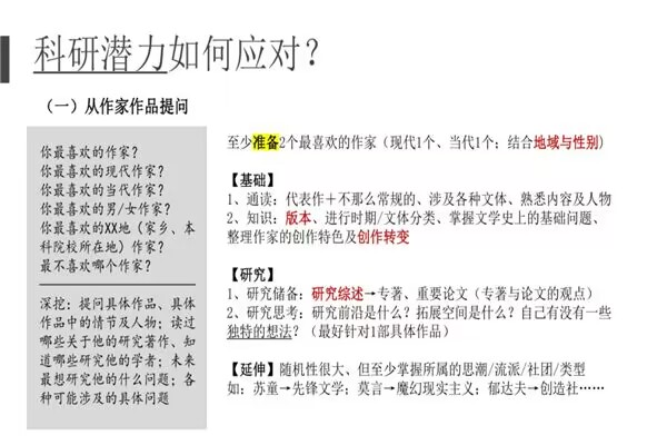 除此之外,在线上参与分享会的比较文学与世界文学方向的李蔚然阐述了自己方向选择的原因,还特别提到了专业基础知识梳理和模拟面试流程的重要性。对于面试设备与场地、英语面试准备,李蔚然也进行了贴心的建议。同时,她以自己的阅读体系为例,分享了自己的阅读维度和思路、方法。现当代文学方向的蔡鸿轩详细分析了除常规选择之外的院校、专业的利与弊,并针对文学史复习推荐了一些教材和网络课程资源。她还从五个方面对面试中的科研潜力问答提供了全面而具体的应对方法,打开了同学们的视野。