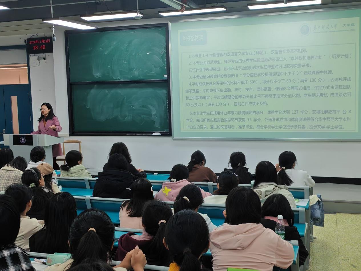 文学院讯(通讯员 梁芳怡 张执 罗罡 杨镇瑜 马思齐)为贯彻落实“三全育人”教育理念,切实发挥名师导航作用,引导学生更好地规划学习生活,明确未来学业发展方向,11月24日晚,学院2024级本科“院长说人培”主题晚点名在八号楼8210教室开展。本次活动特邀学院副院长陈蓓担任主讲人,重点对人才培养方案、专业研究方向和就业方向进行介绍。