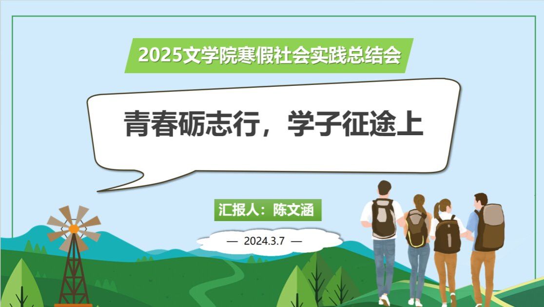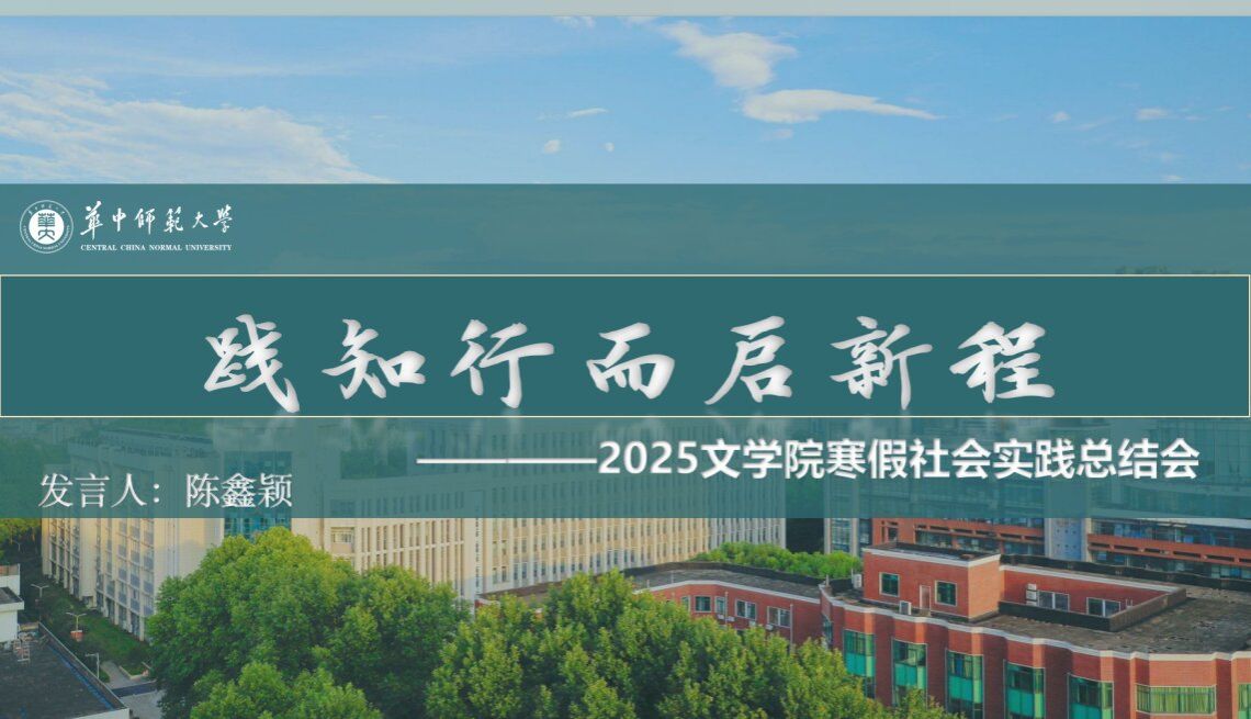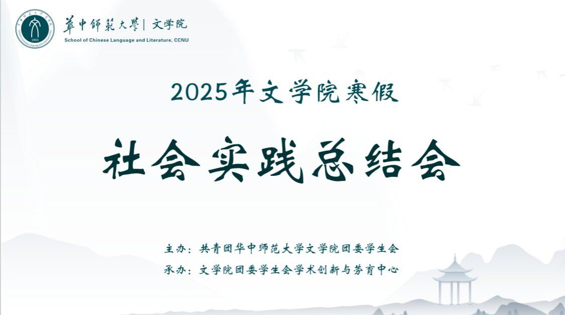 文学院讯(通讯员 张雅贤)3月7日晚,华中师范大学文学院2025寒假社会实践活动总结会在线上举办。本次会议邀请了寒假社会实践优秀代表,2022级本科生陈文涵,2023级本科生陈鑫颖作为主讲人进行分享。由文学院团委学生会学术创新与劳育中心干事吕贤担任主持人,会议面向文学院全体本科生。