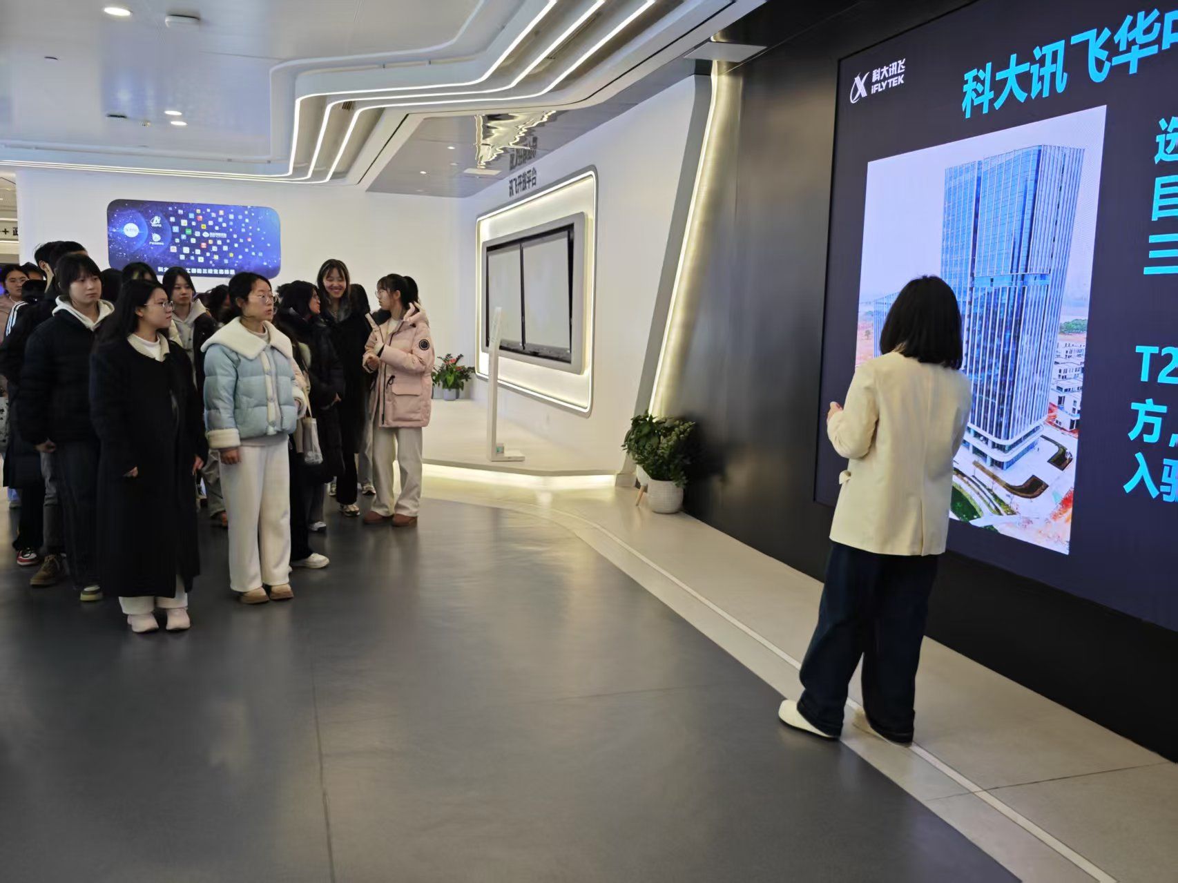 活动伊始,同学们在讲解员绘声绘色的解说中参观了科大讯飞AI技术应用展厅。以AI虚拟主播晓颜的一段多语言介绍拉开序幕,展厅展示了AI技术在工业、交通、智慧城市等多元领域的“硬核”应用,让人目不暇接。观“AI+办公”,AI语言技术赋能两会报道,既提升了新闻生产与传播效率,又为新闻报道注入创新活力;览“AI+教育”,智能语音识别与批改查重系统让同学们感受到AI如何精准辅助专业学习,为学术研究保驾护航;再探“AI+医疗”展区,个人健康AI助手的现场体验与辅诊系统的实例展示让大家领略到科技赋能生命健康领域的无限潜力……每一处细节、每一张图例,无一不彰显着AI技术的无限可能,也让同学们深刻体会到“科技赋能生活、改变生活”的真谛。