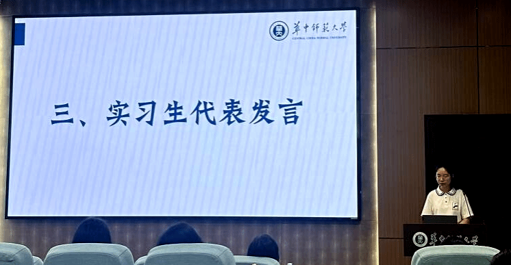 黄乐欣作为实习生代表发言。她对学院领导和老师们的辛勤付出表达感谢,并代表全体实习生郑重承诺:将以饱满的热情投入实习,在实践中提升育人本领,严守纪律,认真完成每一项实习任务,不负学院的期望。