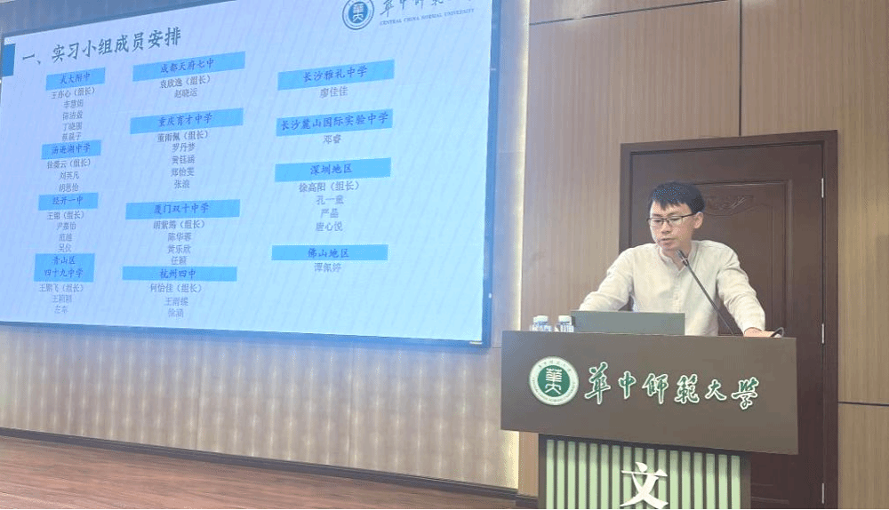 大会伊始,黄凯详细介绍了实习小组的成员安排及实习地区分布。本次实习覆盖重庆、成都、厦门、杭州、广州、长沙、武汉7个地区,包括武汉大学附属中学、汤逊湖中学、重庆育才中学、厦门双十中学等12所优质学校。他强调,实习是研究生培养的重要环节,同学们需服从带队老师和指导老师的安排,加强团队协作,确保实习任务圆满完成。