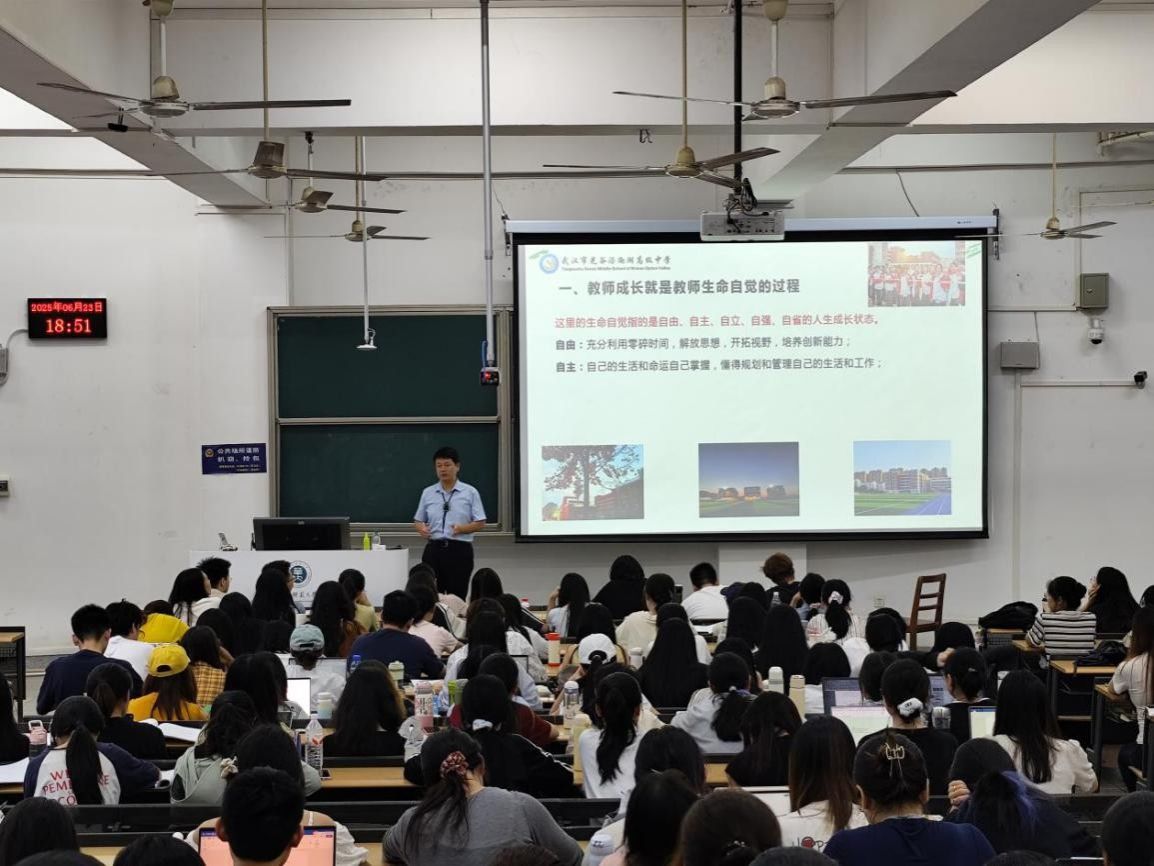 6月23日晚,“精神明亮,心怀未来:教师因生命自觉而精彩”见习讲座在9号楼9-11顺利举行。本次活动由华中师范大学文学院举办,武汉市光谷汤逊湖高级中学校长石伟华受邀担任主讲嘉宾。石伟华是光明社《教育家》“寻找中国好校长”上榜人物,湖北省作协会员,武汉市中语会理事会员,在《读书》《语文教学与研究》《语文学习》等期刊杂志上发表了近百篇论文作品,曾获得武汉市“优秀青年教师”“光谷好老师”“优秀班主任”等多项荣誉。