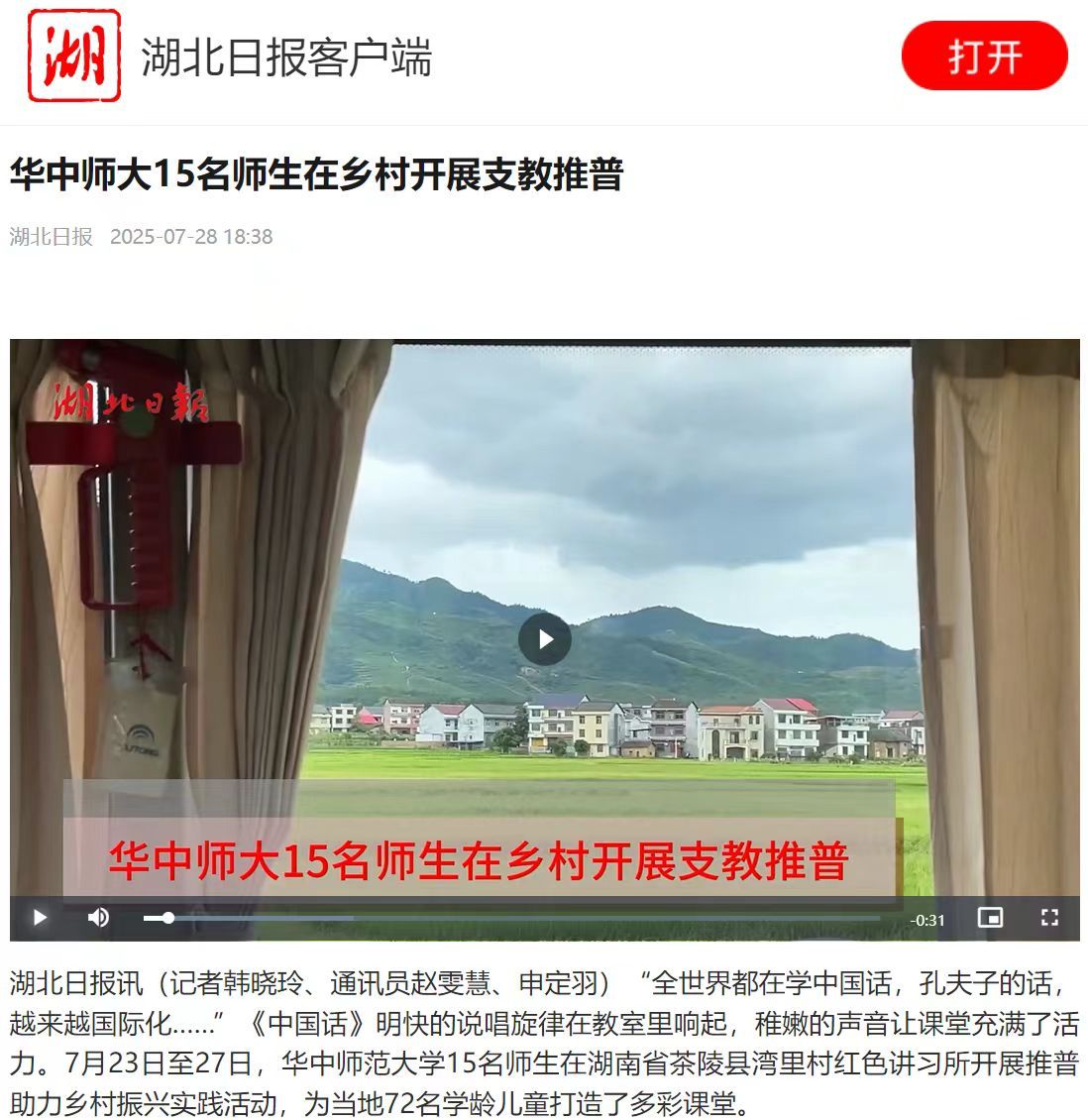 文学院讯(通讯员 陈慈 熊文卉 李雪琴 各实践队供稿)这个暑假,文学院各实践队奔赴祖国各地,开展托管服务、推普下乡、直播助农、文化保护等精彩纷呈的实践活动。志愿者们以青春热忱投身社会实践,活动扎实的成效赢得了实践地群众的高度认可与热情参与。据不完全统计,文学院暑期社会实践受到新华社、学习强国、中国新闻网、湖北日报、湖南日报等国家级、省市级主流媒体报道40余次,生动诠释了文学院学子在服务社会中展现的专业素养与责任担当。