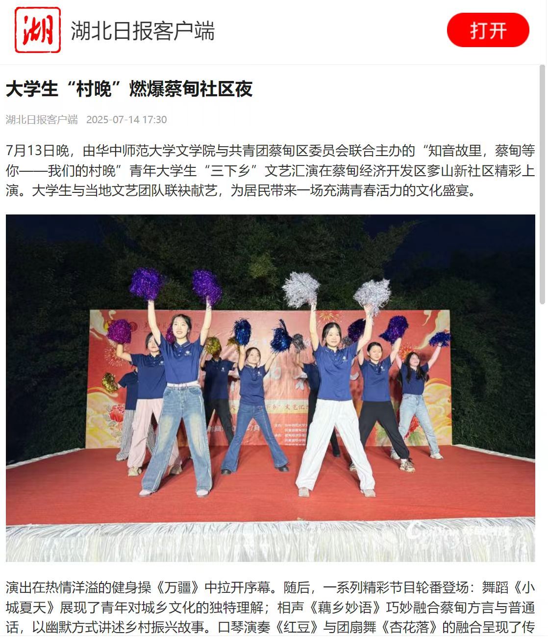 “逐梦知音”实践队深入湖北省武汉市蔡甸区,开展了一场聚焦文农旅产业融合发展的社会实践,助力蔡甸加快打造精品文旅新样板。活动吸引了各大媒体的关注和报道,在学习强国、湖北日报等官方媒体上都有“逐梦知音”实践队的身影。