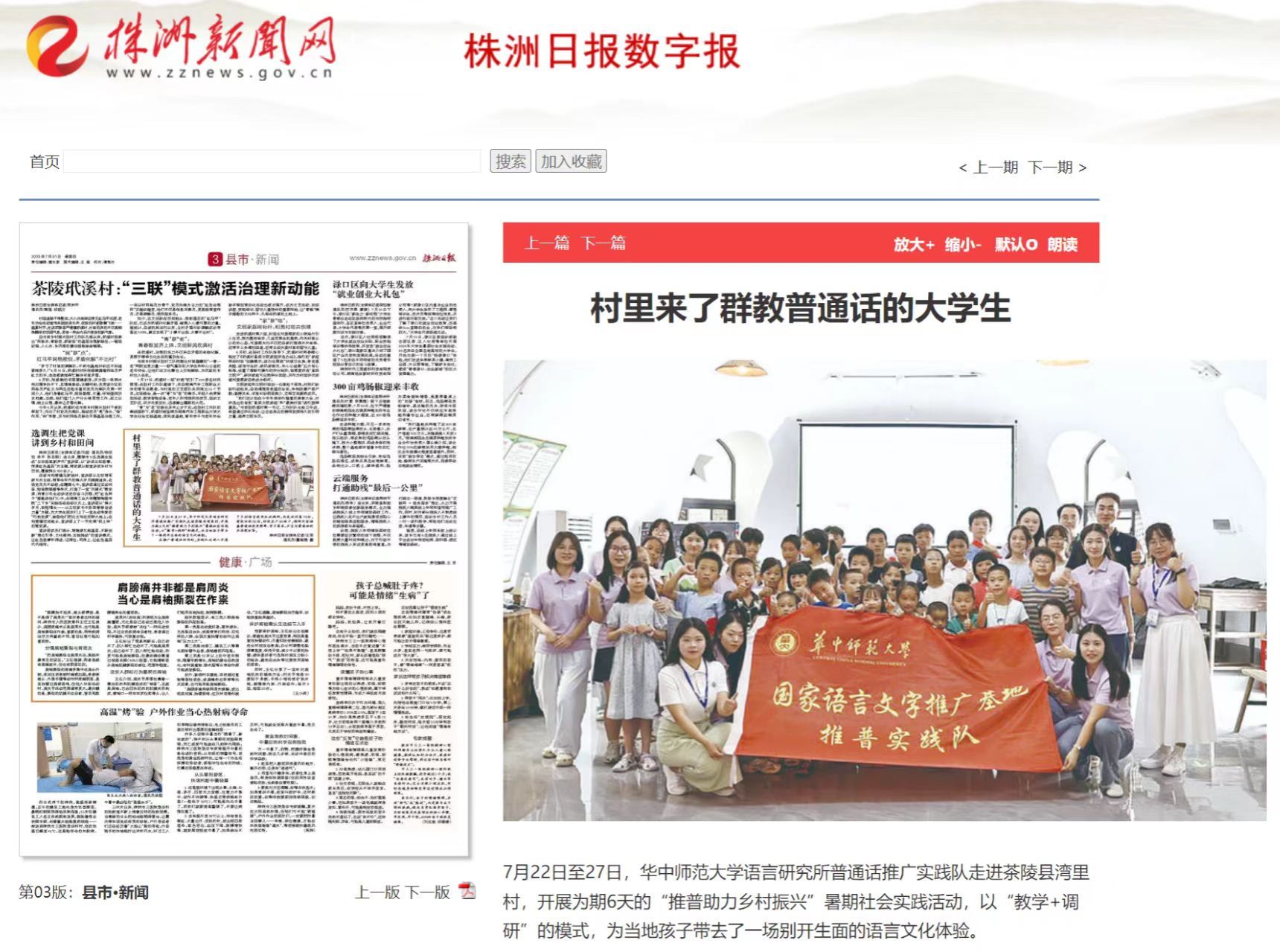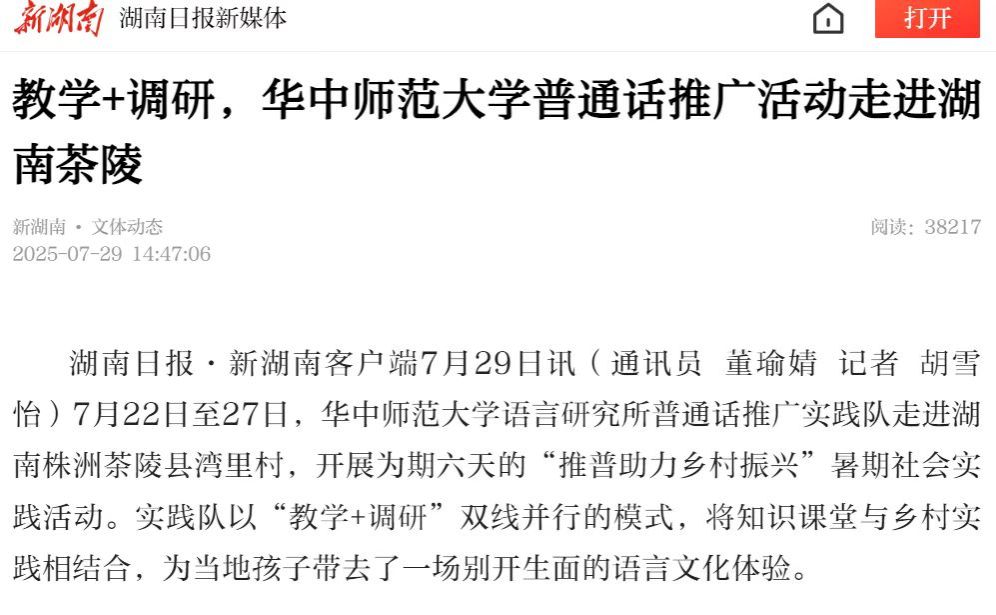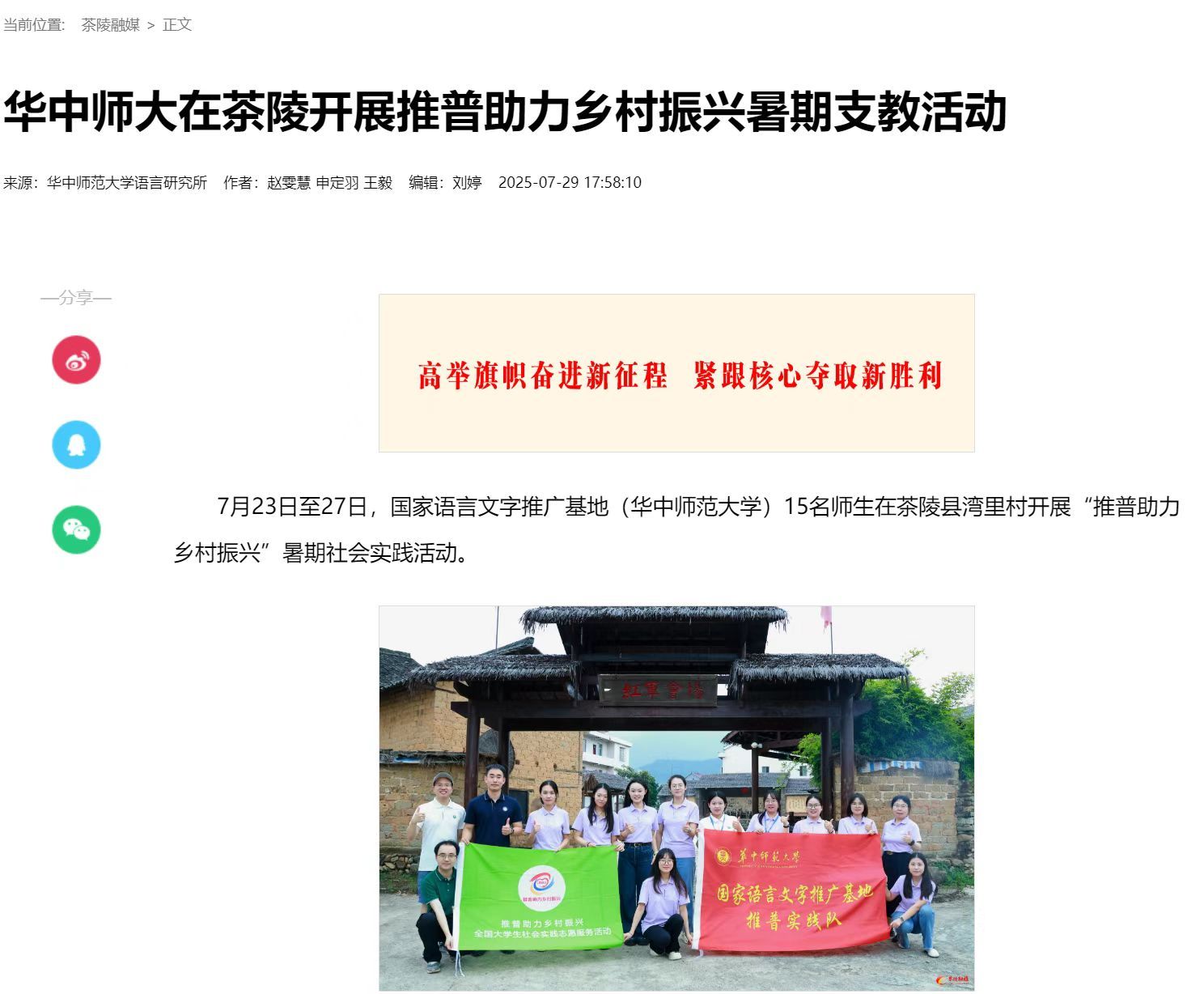 语言研究所推普实践队15名师生走进湖南茶陵县湾里村,为72名学龄儿童带来一场融合语言提升与多元成长的实践盛宴。队员们还深入70余户村民家中调研语言使用情况,精准把握需求。活动持续以语言之力赋能乡村振兴,让多元成长体验扎根乡土,吸引了湖北日报、湖南日报、株洲日报等各大媒体的报道。