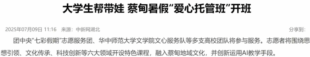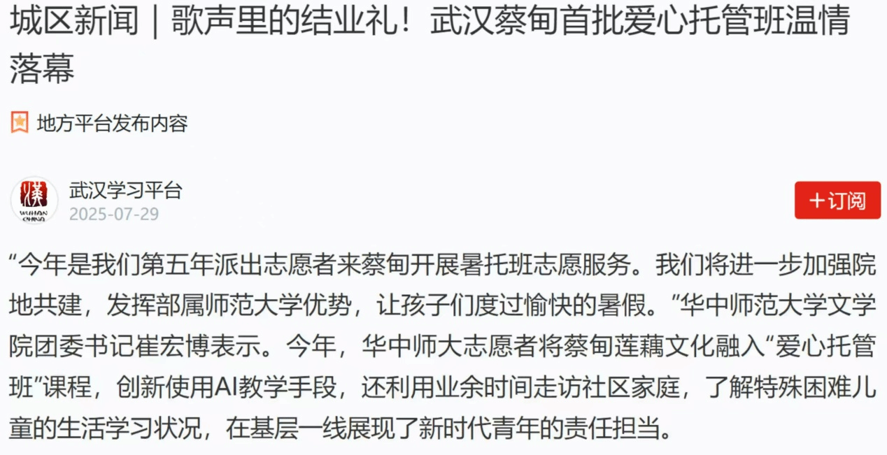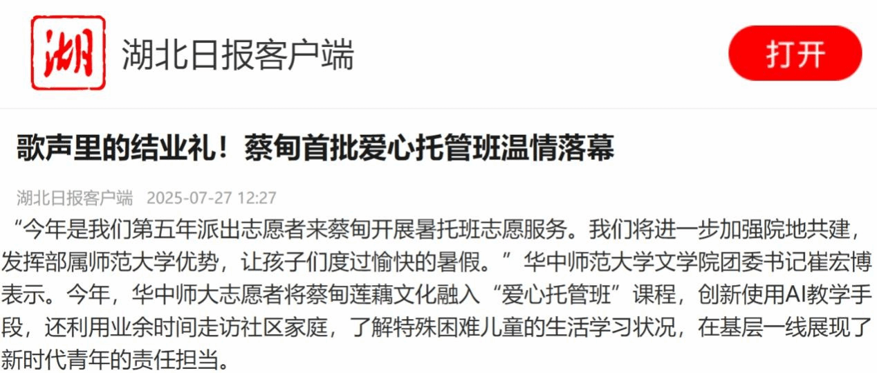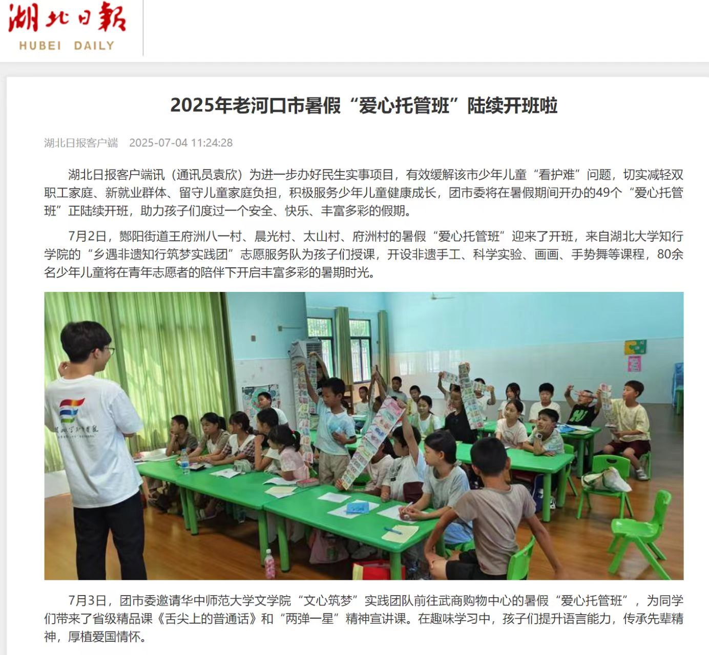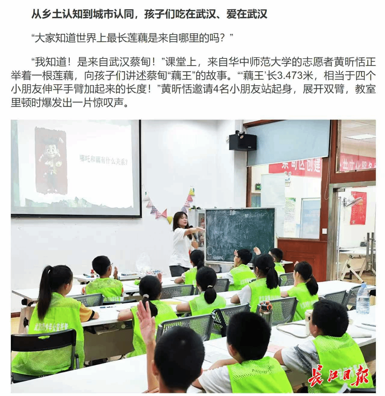 文心服务队志愿者们参与武汉市蔡甸区暑假“爱心托管班”志愿服务,开展特色课程活动,并深入社区调研。有关活动被学习强国、中国新闻网、湖北日报、长江日报、青春武汉等媒体报道20余次。其中团市委、长江日报对院地共建和特色课程进行了专访报道,传达了华师文院学子坚守志愿精神的时代强音。