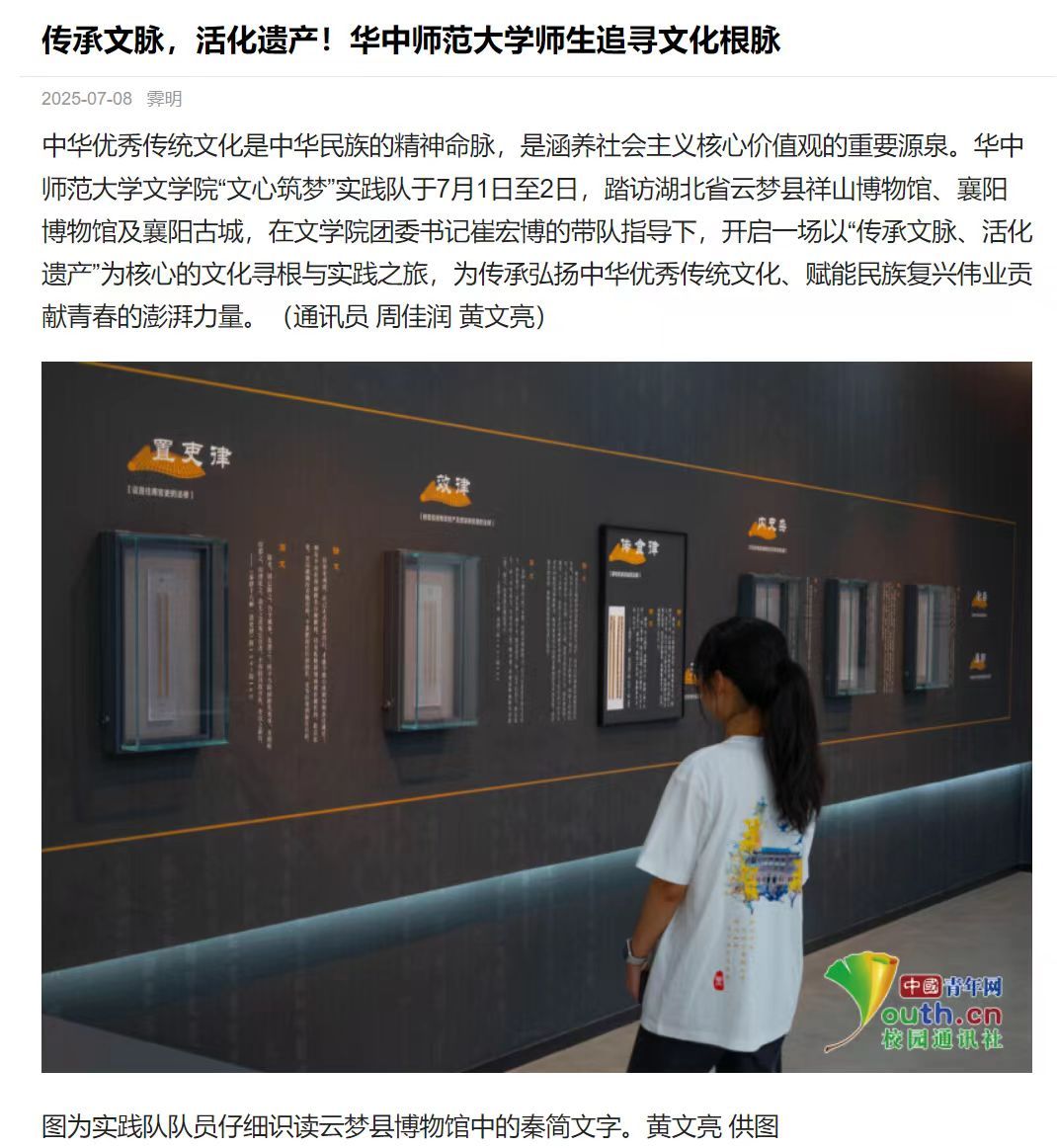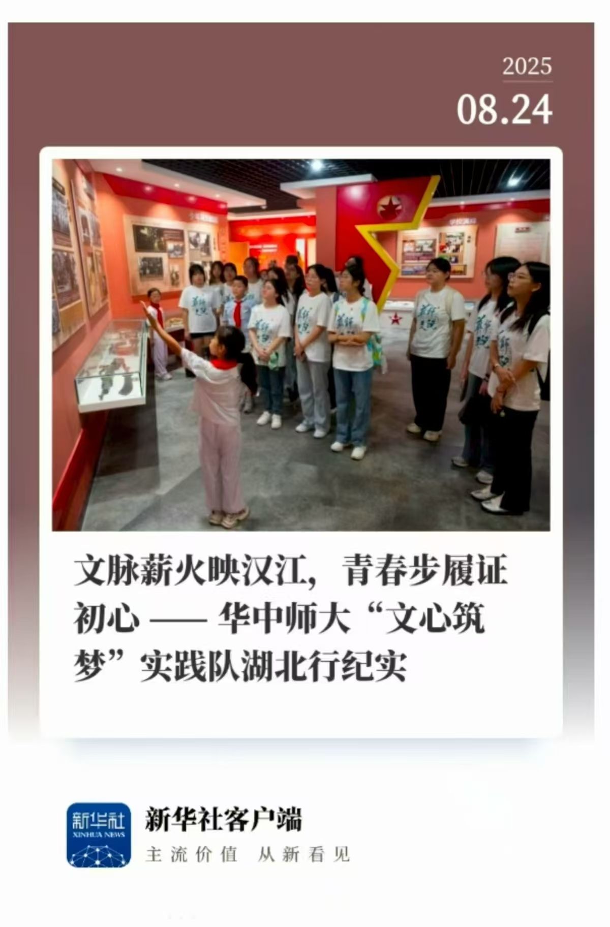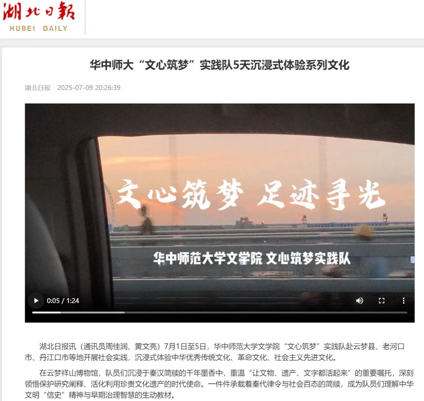 文学院文心筑梦实践队围绕文化强国建设、光未然红色文学、社会主义先进文化、推普助力乡村振兴四个课题分别展开调研实践,沉浸式感悟中华优秀传统文化、革命文化与社会主义先进文化的深厚底蕴与时代价值。实践队成果丰硕,相关活动先后被新华社、中青网、湖北日报等多家媒体报道。