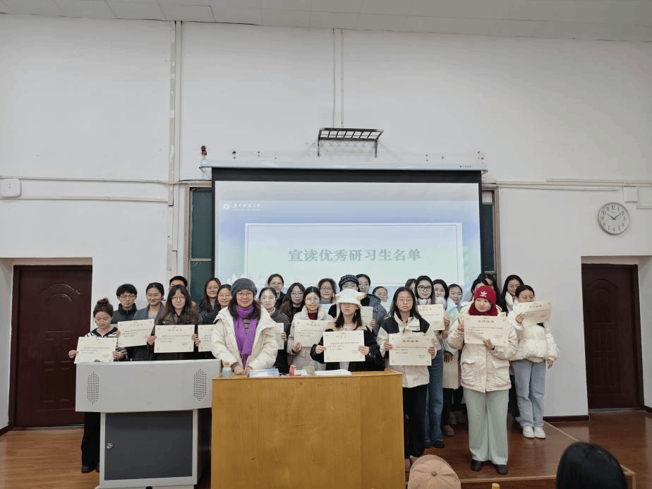 在表彰环节,陈蓓副院长、黄甜甜老师、杜娟老师和余雪婷老师宣读优秀实习生、优秀实习小组及优秀研习论文获奖者名单,并为获奖同学颁发荣誉证书。