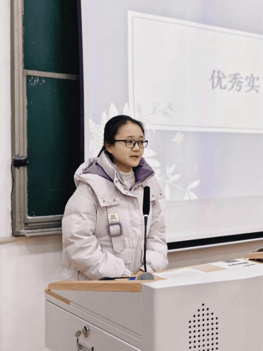 分享交流环节,优秀学子代表依次登台,畅谈实践感悟。优秀实习生代表张睿仪以“敬畏”“生长”“看见”为关键词,生动讲述了自己从课堂观摩到实战授课的成长历程。她坦言,对教育事业的敬畏之心是前行的基石,在实践中的点滴积累能促成自我生长,而学会看见学生则是教育的初心所在。