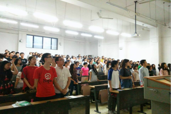 随后,全体同学起立奏唱中国共产主义青年团团歌。在高亢的团歌声中,团总支活动正式开始。在班级展示环节,首先登场的是非师二班,他们带来的汇报节目是诗朗诵“以青春的名义”。非师二班的三位代表陈怡俊、仲朝莹、冯宝文通过朗诵的形式表现了二班团支部同学的活力。紧接着是非师三班的同学,他们展示了本班同学的先进事迹,团支部选取了先进个人刘桐的“新创业史”、舒佳欣同学前往盘龙镇采访的经过和张成琨同学的文学创作。随后,非师一班以“独行快,众行远”为主题介绍了一班团支部两年来的活动经历,特别是与武汉大学电子信息学院同学的联谊活动;非师五班也用类似的形式,介绍了团支部往日的点点滴滴和班导师陈宁老师的寄语。文史直博班的同学们用数据展示了团支部建设成果——“文史沙龙”、“专业兴趣小组”和《九思》刊物。最后非师四班同学们用视频给同学们送去了自己的祝福,并用一首《樱花草》为展示环节画上了圆满的句号。