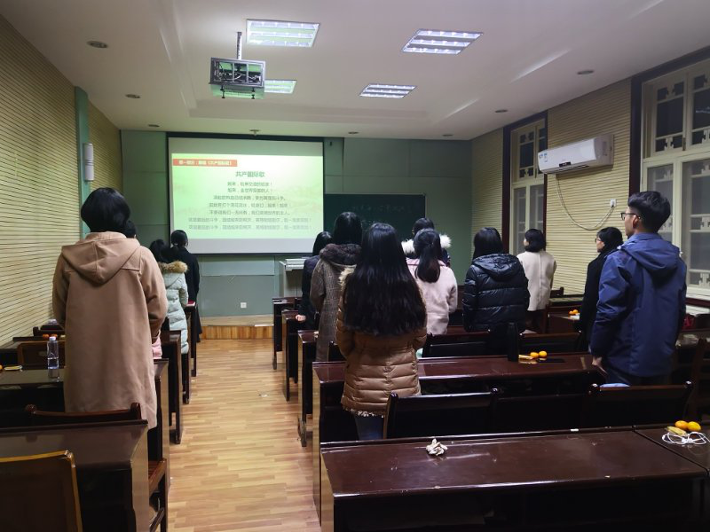 在组织委员李嘉婷清点人数后,会议在支部书记卫玥同志的主持下正式开始。首先,大会进入第一项:参会人员共唱《国际歌》,在慷慨激昂的氛围下,