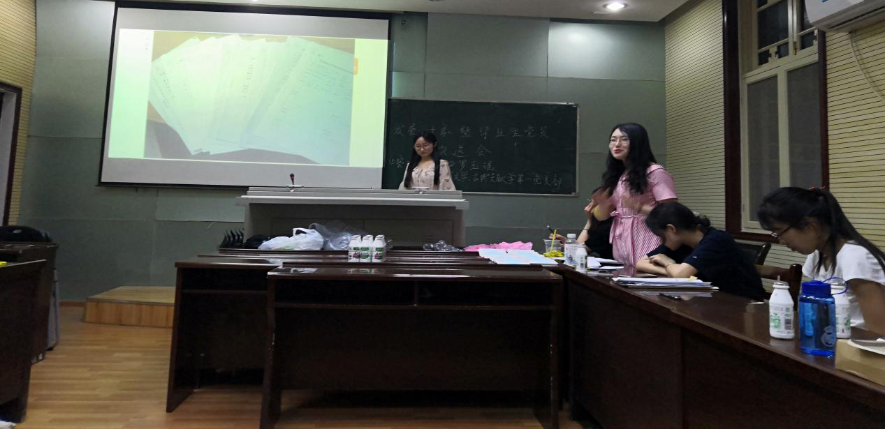 活动由支部书记庞璐同志主持开展。其首先谈到在欢送会上先进行支部工作汇报的初衷。古代文学、古典文献学第一党支部主要由2016级和2017级的硕士和博士研究生组成,2016级党员在支部中占绝大多数,因而支部工作的日常开展和创优评优,与之配合与贡献密不可分。
