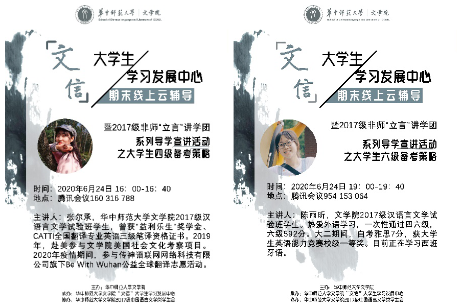 (通讯员 孔祥寅 魏嘉伟)6月24日下午,“文学院学习发展中心期末线上云辅导暨2017级非师“立言”讲学团系列宣讲活动”在线上会议室举行。本次系列宣讲活动由华中师范大学文学院主办,文学院“文信”大学生学习发展中心承办,文学院2017级中国语言文学类学生会协办。宣讲人为文学院2017级汉语言文学试验班学生张尔承、陈雨昕。