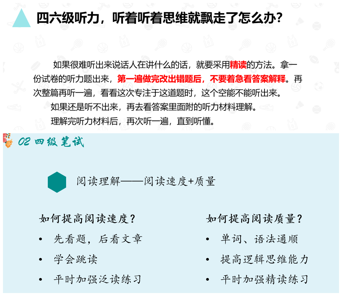 张尔承则是主要介绍了提高文段阅读速度的方法,“阅读速度强调的是对文章信息点的快速抓取的能力,在很短时间内捕捉到与题目相匹配的信息”,她建议大家平时多进行有针对性的跳读和泛读练习。“跳读是一个建立在理解基础之上的能力,也就是前提是你能快速理解每一段甚至每一句的意思,再有针对性地捕捉信息。”不过同时她也提到跳读要求有比较成熟的语言能力,对单词、语法、句型都需要很好地掌握,“平时可以多尝试一些泛读练习,读的时候把握文章整体脉络和论证思路,理解文章中一些关键性信息,知道每一段大概讲了什么。”