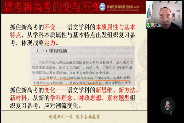 在第二环节中,吴老师以“思考新高考的变与不变”为中心,指出我们应该抓住新高考的不变——语文学科的本质属性与基本特点,从学科本质属性与基本特点出发组织复习备考。同时,我们还应抓住新高考的变化——语文学科的新思维、新方法、新材料,从新的学科理念、时政思想、素材题型组织复习备考,应对潮流变化。