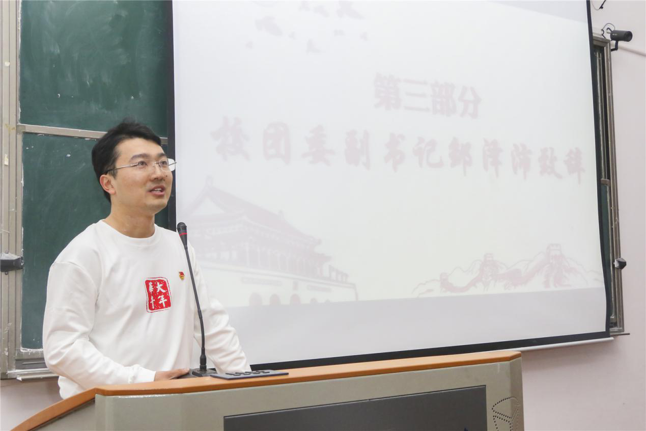 随后,文学院党委副书记徐福刚为同学们讲授团干培训的开班第一课。围绕着团学干部的初心与使命这个主题,徐福刚首先用三个问题引入,启发大家作为团学工作者,要发自内心地认可自己的工作,做到初心不改,使命必达,将这份责任感内化于心,外化于行。同时,他也希望同学们能端正心态,在日常活动中培养规则意识,独立思考自己的价值与意义,积极向前探索并加以积累,将自身和文学院融为一体。通过战“疫”期间团学干部工作事件的举例,徐福刚肯定了同学们的情怀和担当,也借此鼓励大家向他们看齐,不忘初心,努力向前。在谈到团员和党员之间的关系时,他表示:“作为党的后备军和助手,团学工作者要在党的领导下展开工作,始终牢记党的初心和使命,为社会做贡献、为学校谋发展、为集体谋幸福。”