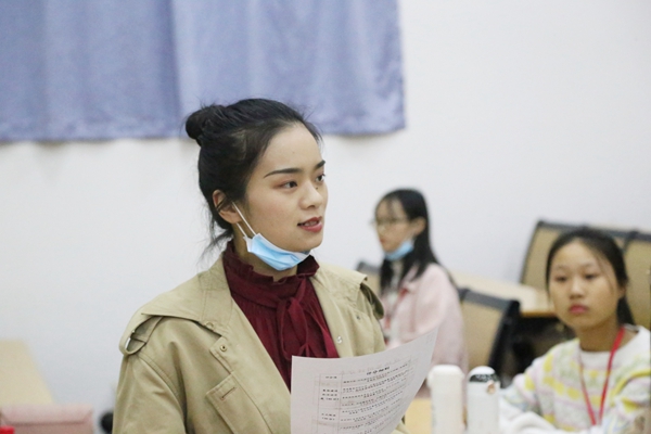 2019级师范生集体代表刘永辉紧接其后上台答辩,她从技能培训、特色活动、年级文化和特色活动三个方面向观众展示了2019级师范生的青春面容和卓越才干,突出了“朝气——创新”的精神。刘永辉重点讲述了“文小师云上自习室”在促进同学们潜心学习,云上讨论,共同进步方面的重要作用。此外,“小星光打卡计划”“三行情书”“连心战疫,c路同行”等特色活动也得到了评委和观众的赞许和认可。