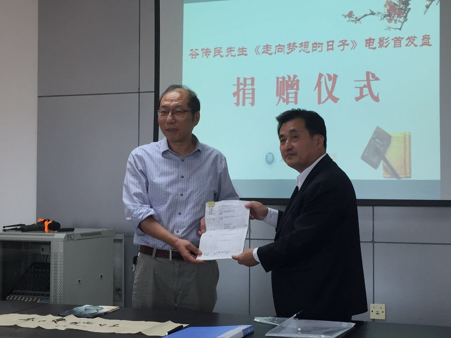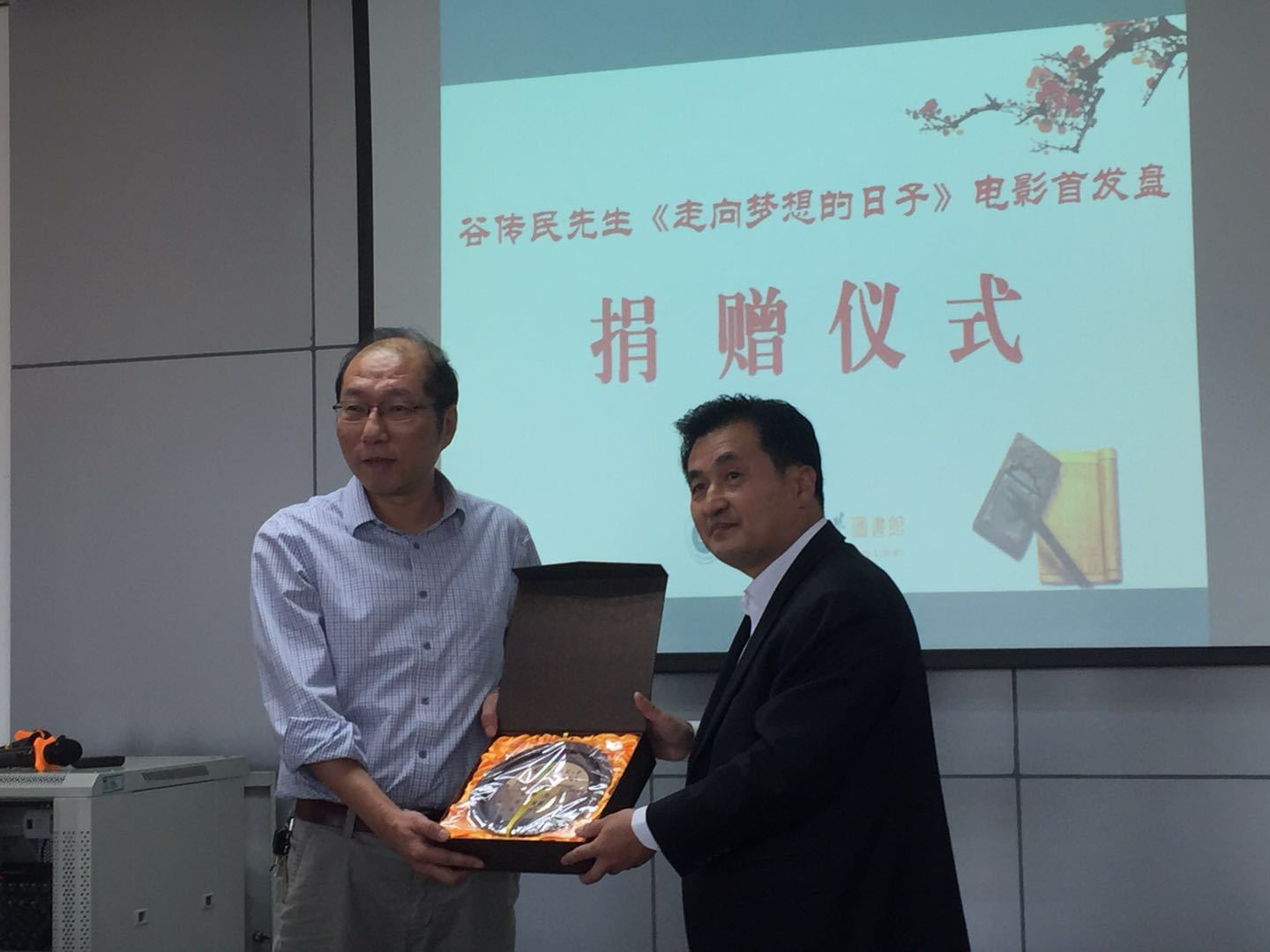 谷传民把百年华师首部电影《走向梦想的日子》电影首发盘、影片摄制场记单、国家广电总局鉴发的龙标片头及技术合格证、电影片名书法原件等五件藏品赠予母校博物馆。他说,电影《走向梦想的日子》是以华中师范大学音乐学院学生李强为原型改编创作的一部弘扬励志与大爱精神的影片,在社会上引起很好反响。华师是一个充满了大爱的家园,作为华师校友,他希望能将此部反映华师大爱精神的影片首发盘赠予母校,以此回馈母校的教育和关怀。