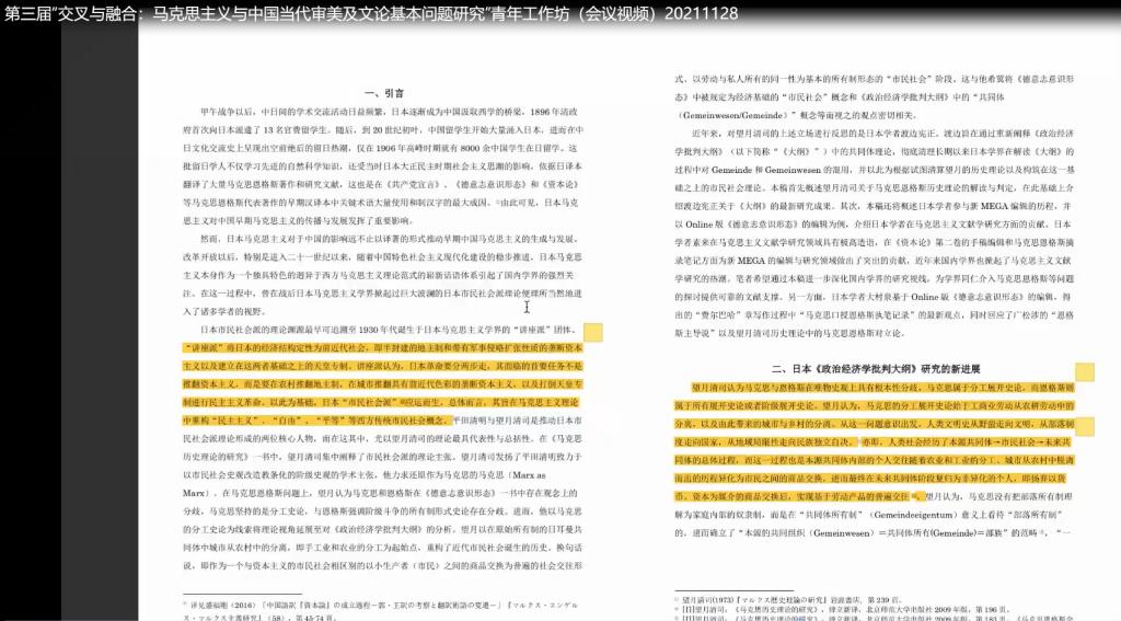 (通讯员 谢佩瑾 周雨超)2021年11月28日,第三届“交叉与融合:马克思主义与中国当代审美及文论基本问题研究”青年工作坊在线上举办。会议由华中师范大学文学院和中国语言文学一流学科“马克思主义文学批评”青年学术创新团队主办。来自武汉大学、华中科技大学、中国政法大学、华中师范大学、华中农业大学、天津师范大学、中国石油大学、汕头大学、河南大学、湖北大学等全国各高校的约五十位青年学者参加了此次会议。