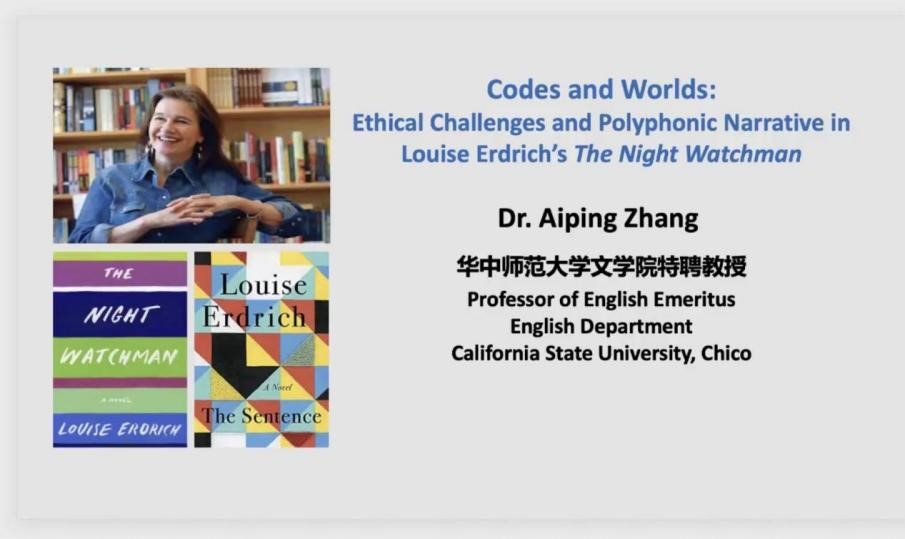 (通讯员 汪希)12月15日,美国文学研究专家、加州州立大学奇科分校英语系终身教授、华中师范大学文学院特聘教授张爱平老师,以腾讯会议的交流形式为文学院比较文学和世界文学专业师生作了题为“符码与世界:路易斯·厄德里克《守夜人》中的伦理挑战与复调叙事”的学术讲座。此次讲座由比较文学与世界文学学科带头人苏晖教授主持,杨建教授、刘兮颖教授、刘云飞老师及本学科的硕博研究生聆听了讲座。